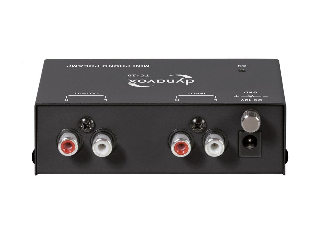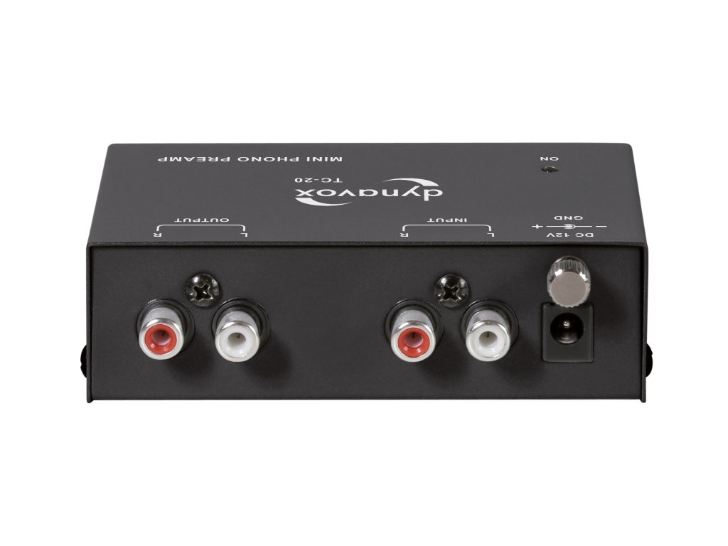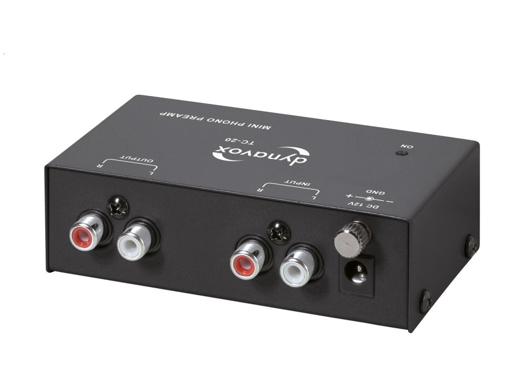 Kvalitní MM Phono předzesilovač pro gramofonové přístroje Dynavox TC-20 Phono předzesilovač je určený pro použití pro gramofonové přístroje a zesilovače bez Phono vstupu, nebo jako náhrada za méně kvalitní předzesilovače. Kompaktní Phono předzesilovač v kovovém pouzdře nabízí vysokou kvalitu zvuku s externím napájením. Osazení: RCA vstupy a výstupy signálu Zemnicí šroub Provozní LED Napájecí adaptér Technické údaje: Frekvenční rozsah: 20 Hz - 20 kHz (±2 dB)Výstupní napětí: 2 V max. (P-P) bei 10 kOhmTHD: 0,08 % (1 kHz / 3mV)Vstupní citlivost: 3 mVVstupní impedance: 50 kOhmImpedance zátěže: 10 kOhmNapájecí zdroj: 230V(AC)/50 Hz - 12V(DC)/150mARozměry (Š x V x H) cca 105 x 32 x 65 mmHmotnost: 0,23 kgDoplňkové parametry