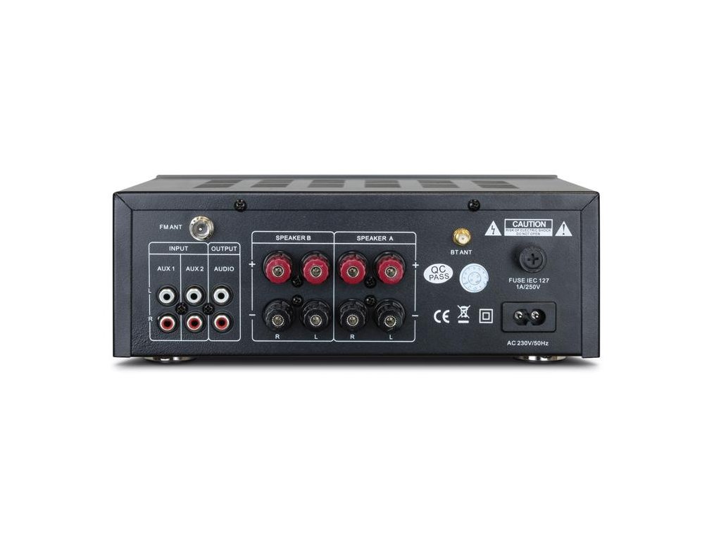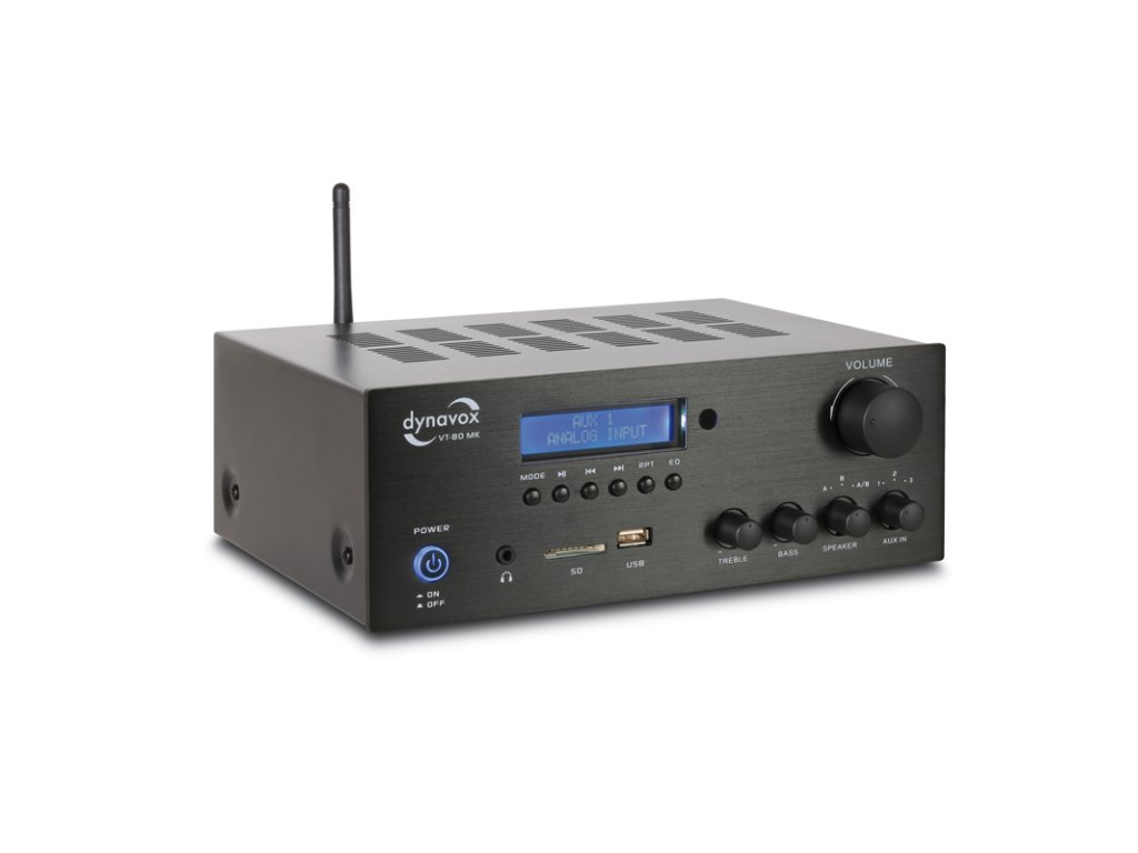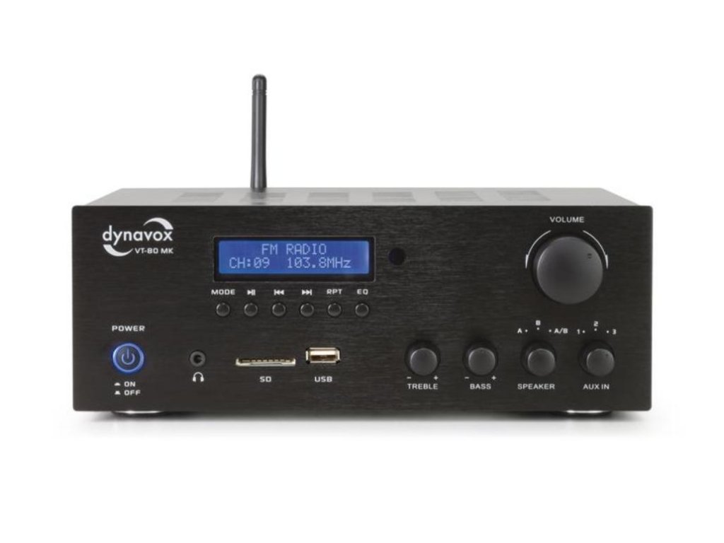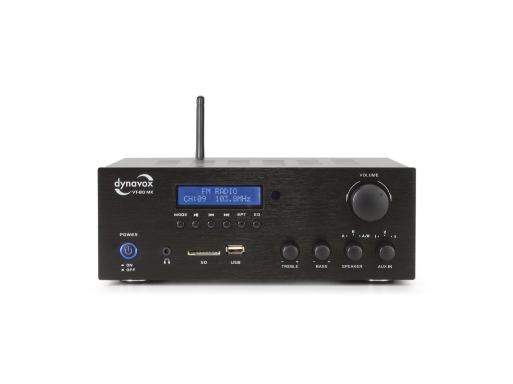 Stereofonní kompaktní zesilovač 2x75W / SD, USB, Bluetooth, FM tuner Dynavox VT-80 MK je rozšířenou verzí mimořádně úspěšného Dynavox VT-80. Kromě drobných vizuálních změn díky novým, atraktivnějším ovládacím tlačítkům má nyní také FM tuner a nový displej. Nový displej je nyní větší než dříve a vedle rozšířených informací zobrazuje názvy titulů přehrávaných souborů MP3. Jinak se nic nezměnilo. Dynavox VT-80MK je vysoce kvalitní stereofonní kompaktní zesilovač pro připojení dvou analogových vstupních zdrojů (Cinch), jakož i pro digitální vstupní signály (SD / USB a BT [V2.1]). S VT-80MK máte možnost připojit 2 páry reproduktorů, které lze přepínat v párech nebo ovládat současně. Díky tomu je ideální pro druhou místnost, terasu atd. Kromě toho má VT-80MK regulovaný, předem zesílený výstup signálu (předzesilovač) pro provoz přídavného výkonového zesilovače nebo aktivního subwooferu, 2-pásmového Ovládání zvuku a dálkové ovládání pro ovládání vstupů digitálního signálu. Malé rozměry zařízení dělají z VT-80MK prostorově úsporný zesilovač pro malý až středně velký stereo systém. Pro současný provoz všech 4 reproduktorů je nutné použít reproduktory s impedancí mezi 8 - 16 Ohm !!! Technická specifikace: Frekvenční charakteristika: 20 Hz - 20 kHz (+/- 3 dB)Jmenovitý výstupní výkon (hudba / 4 ohmy): 160 WImpedance: 4 - 8 OhmVstupní citlivost: 220 mV (1 kHz, THD 1%)Zkreslení: 0,3% (1 kHz, 1 W)Poměr signál-šum: 83 dBSpotřeba energie: 75 WVstupy: 2 x stereo cinch socket, SD, USB, BT a FM tunerVýstupy: PRE-OUT (stereo cinch) banánové šroubové svorky pro 4 reproduktory, 3,5 mm konektor pro sluchátkaPodporované formáty (USB / SD): MP3, WAV a WMASíťové připojení: 230 V / AC, 50 HzRozměry (ŠxVxH): 250 x 180 x 95 mmHmotnost: 2,9 kg Barevné provedení: černéDoplňkové parametry