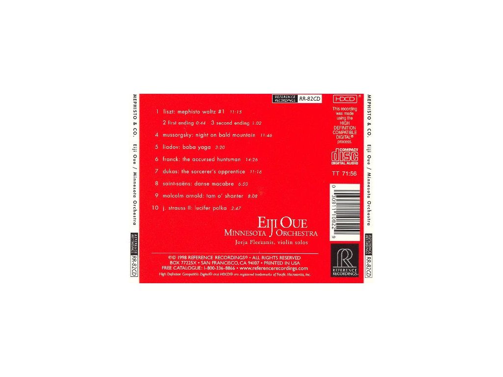 Referenční HDCD Catalog No: RR-82Artists: Eiji Oue, Minnesota OrchestraComposers: Anatoly Lyadov, Camille Saint-Saëns, César Franck, Johann Strauss II, Malcolm Arnold, Modest Mussorgsky, Paul DukasRelease Year: 1998-10-27Available Formats: HDCD 1 Mephisto Waltz #1 11:152 First Ending 0:443 Second Ending 1:024 Night On Bald MountainComposed By – Mussorgsky*11:465 Baba YagaComposed By – Liadov*3:206 The Accursed HunterComposed By – Franck*14:267 The Sorcerer's ApprenticeComposed By – Dukas*11:168 Danse MacabreComposed By – Saint-Saëns*6:509 Tam O' ShanterComposed By – Malcolm Arnold8:0810 Lucifer PolkaComposed By – J. Strauss II*Doplňkové parametry