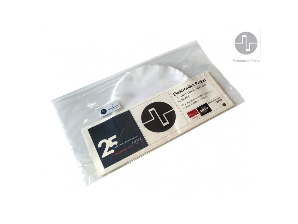 Značka Elektronika Praha je s vámi od roku 1969 a po celou dobu ji reprezentuje typické, elegantní i nadčasové logo, které vzniklo díky kreativitě původního člena hospodářského sdružení, jenž upravil na osciloskopu vykreslený průběh nejrychlejšího signálu do vyobrazené podoby evokující zároveň mechanickou kliku. Logo tak nese informaci, že jde o elektronické produkty vyráběné s vysokým podílem ruční práce. Díky tomu lze říci: máte kliku, že při tvorbě produktů aplikujme typickou českou chytrost a šikovnost, již 55 let máte kliku, že většinu produktů vyrábíme v EU máte kliku, že produkty poskytují mimořádný poměr užitné hodnoty k ceně, možná ten nejlepší na trhu 7" antistatický obal z vysoce kvalitního HDPE Top kvalita japonského provedení Zaoblení obalů usnadňuje zasouvání SP dovnitř a ven bez jejich poškození Antistatická úprava Vysoce kvalitní HDPE 23 µm - polyethylen s vysokou hustotou si udržuje stále stejný tvar a rozměr i při vyjmutí SP desky Odolné proti UV záření a chrání tak umělecká díla před vyblednutím času Velmi hladké na dotek; nepoškrábe vaše desky ani nezanechává usazeniny nečistot 1000 kusů a více za atraktivní ceny Cena za 25 kusů 1 balení obsahuje 25 kusů obalů Made in Japan Co je špatného na papírových a kartonových obalech? Papírové rukávy se mohou v průběhu času rozkládat a na vašem záznamu zůstanou nečistoty. Papírové a lepenkové rukávy (zejména karton) mohou být velmi „drsné“ a po vyjmutí desky mohou na vašich LP zanechat škrábance a nečistoty. Papírové obaly nejsou antistatické. "Nabité" LP desky pak přitahují nečistoty, které je třeba eliminovat. Tím může být výrazně ovlivněna kvalita přehrávání a praskání.Doplňkové parametry