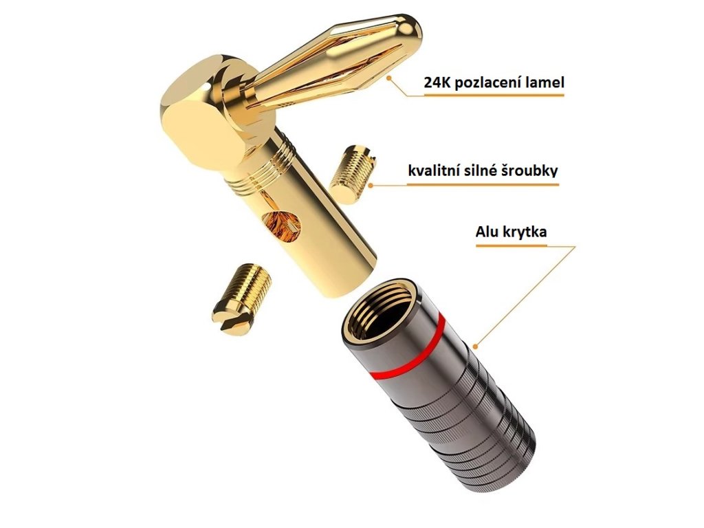Značka Elektronika Praha je s vámi od roku 1969 a po celou dobu ji reprezentuje typické, elegantní i nadčasové logo, které vzniklo díky kreativitě původního člena hospodářského sdružení, jenž upravil na osciloskopu vykreslený průběh nejrychlejšího signálu do vyobrazené podoby evokující zároveň mechanickou kliku. Logo tak nese informaci, že jde o elektronické produkty vyráběné s vysokým podílem ruční práce. Díky tomu lze říci: máte kliku, že při tvorbě produktů aplikujme typickou českou chytrost a šikovnost, již 55 let máte kliku, že většinu produktů vyrábíme v EU máte kliku, že produkty poskytují mimořádný poměr užitné hodnoty k ceně, možná ten nejlepší na trhu Kvalitní reproduktorový banánek pro přímé připojení reprosoustav Reproduktorové banánky (konektory) s nově vyvinutým pružným systémem, které zaručují kvalitní a stabilní kontaktZlaceno 24K pro maximálně čistý přenos signálu Pravoúhlé provedeníKvalitní CNC výroba Uchycení přívodního kabelu - 2x šroubekVhodné pro kabeláž do průměru 4-5mm (včetně) Barevné rozlišení: červeným a bílým proužkem s tmavě chromovaným krytemDoplňkové parametry