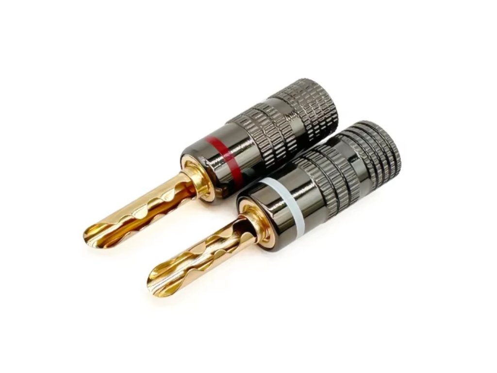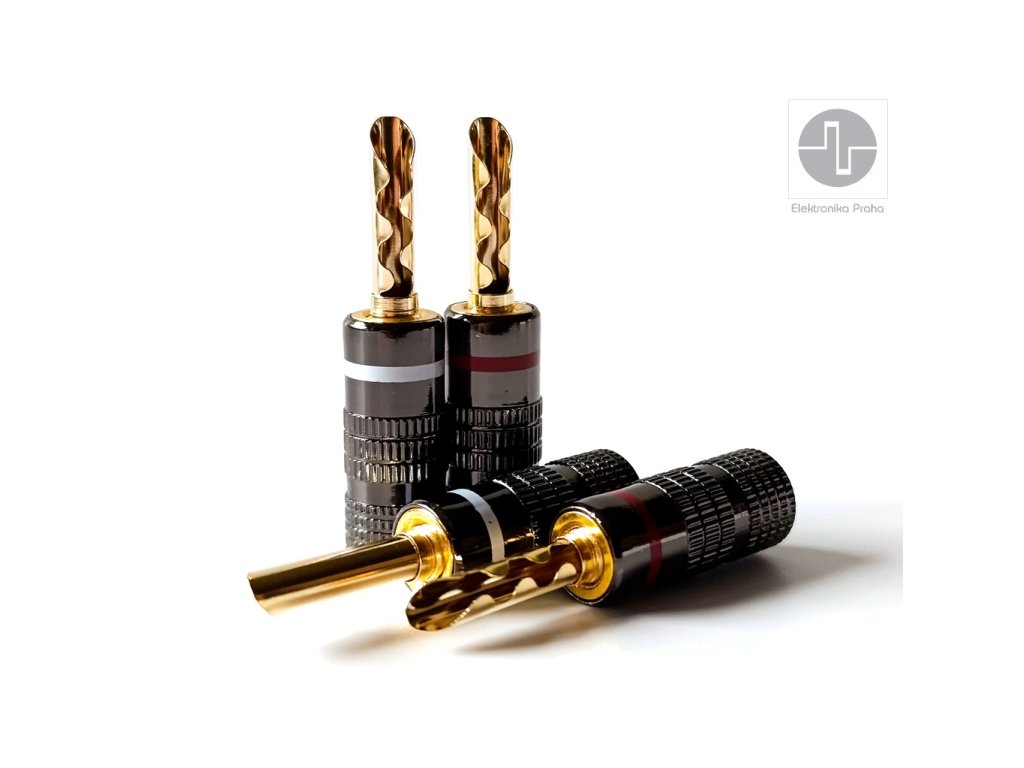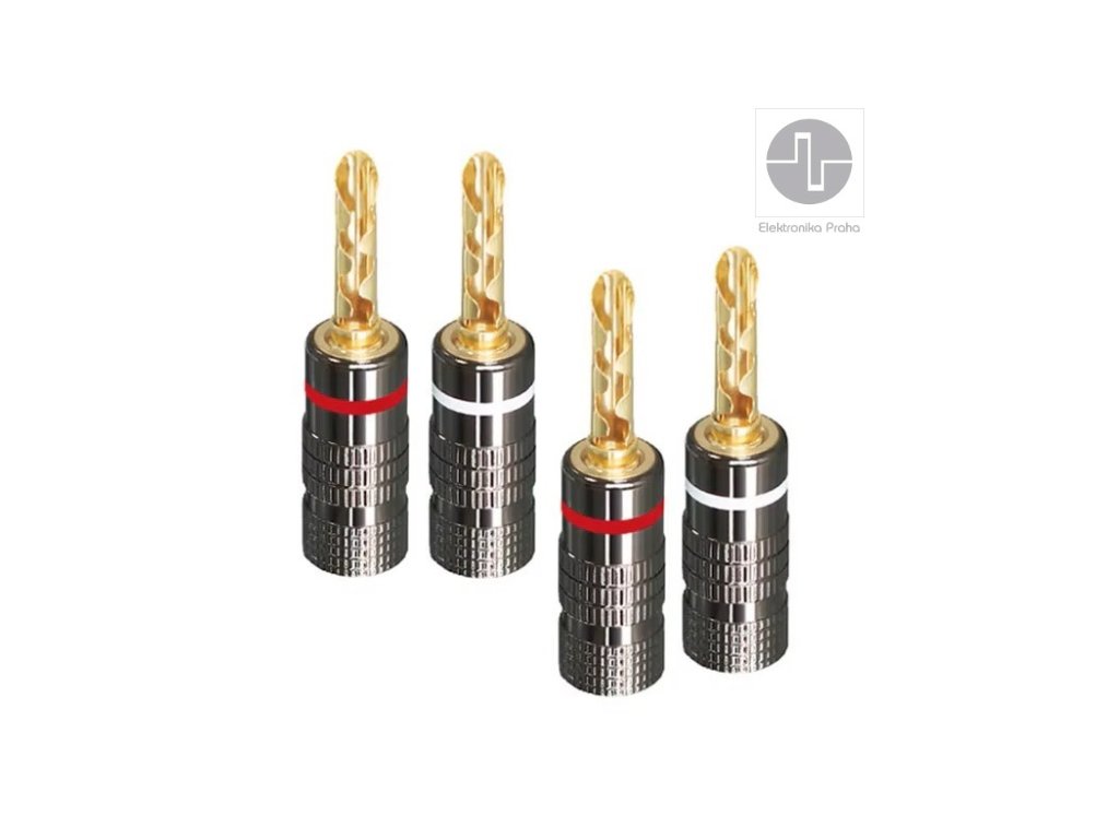 Kvalitní reproduktorový banánek se silnou předpruženou lamelou pro přímé připojení reprosoustav Reproduktorové banánky (konektory) s nově vyvinutým pružným systémem, který zaručuje kvalitní a stabilní kontaktZlaceno 24K pro maximálně čistý přenos signáluKvalitní CNC výroba Dutý banánek se silnou předpruženou lamelou zajišťuje díky velké styčné ploše 100% kontakt po dlouhou dobu Uchycení přívodního kabelu - 2x šroubekVhodné pro kabeláž do průměru 4-5mm (včetně) Barevné rozlišení: červeným a bílým proužkem s tmavě chromovaným krytemDoplňkové parametry