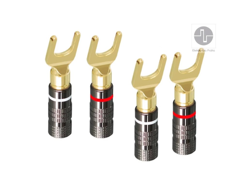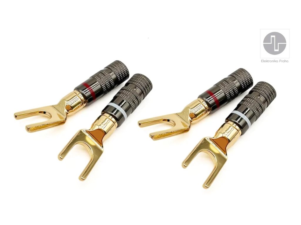 Kvalitní reproduktorová vidlička pro přímé připojení reprosoustav Reproduktorové vidličky (konektory) Zlaceno 24K pro maximálně čistý přenos signáluKvalitní CNC výroba Kvalitní a robustní provedení zajišťuje díky velké styčné ploše 100% kontakt po dlouhou dobu Uchycení přívodního kabelu - 2x šroubekVhodné pro kabeláž do průměru 4-5mm (včetně) Barevné rozlišení: červeným a bílým proužkem s tmavě chromovaným krytem Sada obsahuje 4 kusyDoplňkové parametry