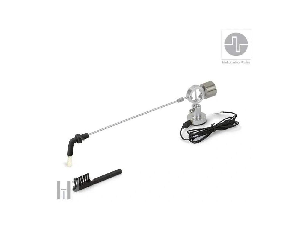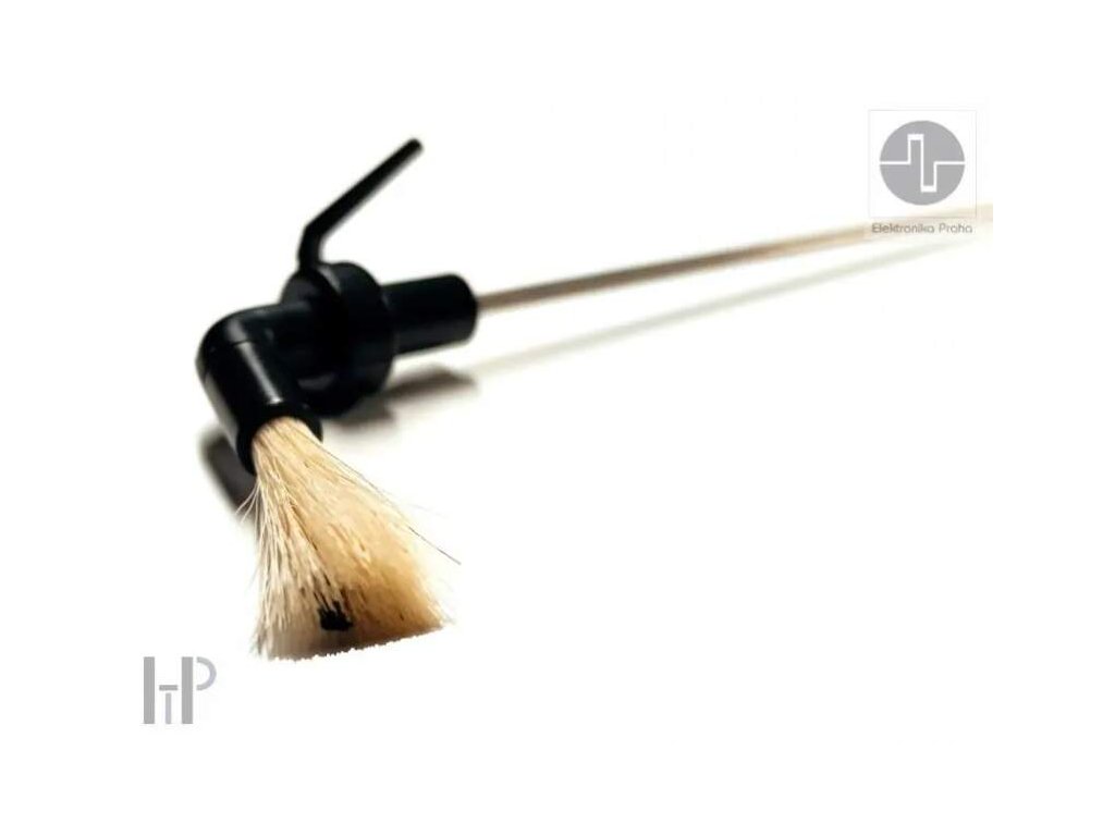 Značka Elektronika Praha je s vámi od roku 1969 a po celou dobu ji reprezentuje typické, elegantní i nadčasové logo, které vzniklo díky kreativitě původního člena hospodářského sdružení, jenž upravil na osciloskopu vykreslený průběh nejrychlejšího signálu do vyobrazené podoby evokující zároveň mechanickou kliku. Logo tak nese informaci, že jde o elektronické produkty vyráběné s vysokým podílem ruční práce. Díky tomu lze říci: máte kliku, že při tvorbě produktů aplikujme typickou českou chytrost a šikovnost, již 55 let máte kliku, že většinu produktů vyrábíme v EU máte kliku, že produkty poskytují mimořádný poměr užitné hodnoty k ceně, možná ten nejlepší na trhu Nejšetrnější způsob čištění vinylových desek, ale i snímacího systému Čištění gramofonové desky při přehrávání díky kartáčku z kozích chlupů. Šetrně odstraní prach a eliminuje vznik statické elektřiny. Velmi kvalitní konstrukce, jednoduchá instalace vč. zemnícího kabelu, který odvádí statickou elektřinu. Raménko se na gramofon upevní díky samolepící podložky. Nastavitelná výška raménka. Všechny kovové části jsou vyrobeny z hliníku a nerezové oceli. Součástí příslušenství je i kartáček na hrot přenosky. Zemnící drátek - zamezení elektrostatických výbojů (ESD). Výškově nastavitelné. Přírodní vlákna: kozí srst s antistatickou úpravou - chlupy se na konci netřepí a neslepují. Uprostřed uhlíková vlákna pro odvedení statické elektřiny. Pro mokré i suché čištění. Čištění samotného kartáče je možné přírodním mýdlem a teplou vodou. ÚDRŽBA DESEK A PŘENOSEK Zřejmě každý zná praskání při přehrávání gramofonových desek. Jeho příčinu často svalujeme na stáří desek. Ve většině případů se však jedná o znečištěnou desku nebo přenosku. Praskání je způsobeno nečistotami a prachem, které k povrchu desky přitahuje statická elektřina. K čištění povrchů gramofonových desek slouží čistící prostředek od EP. Odstraňuje z povrchu nečistoty a zbavuje desku elektrostatického náboje, čímž snižuje rychlost nabalování nečistot na její povrch. Čistý a kvalitní zvuk zajišťuje čistý hrot přenosky. Jakmile přestane být přehrávaný zvuk kvalitní a čistý, je nutné hrot přenosky očistit. Znečištění hrotu přenosky je zobrazeno na obrázcích. Znečištění, kterému jsou desky i přenosky vystaveny výrazně snižuje jejich životnost a následně kvalitu zvuku. Na obrázku je detail opotřebení drážky gramofonové desky.Doplňkové parametry