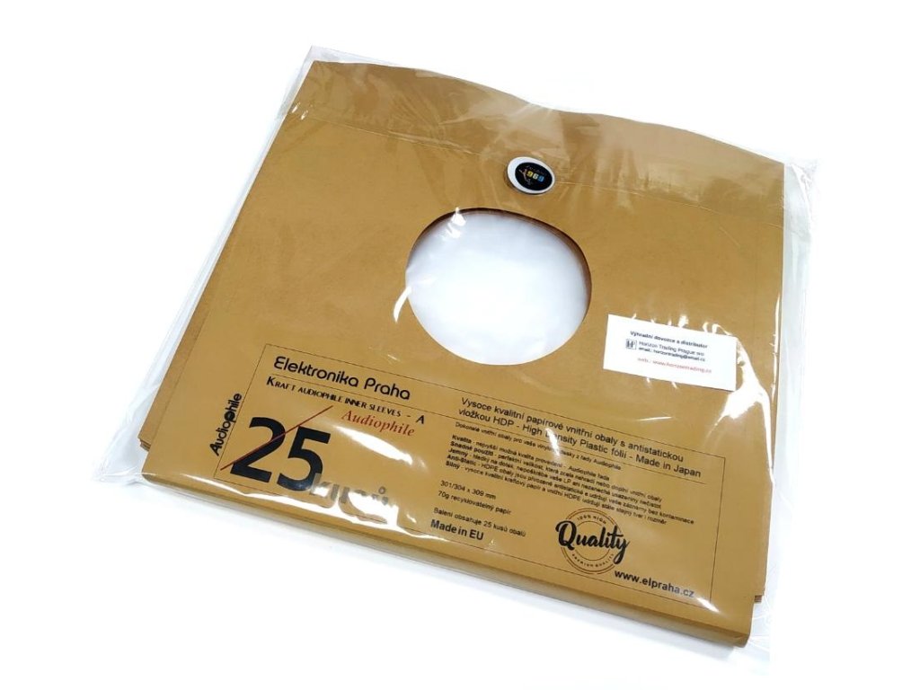 Značka Elektronika Praha je s vámi od roku 1969 a po celou dobu ji reprezentuje typické, elegantní i nadčasové logo, které vzniklo díky kreativitě původního člena hospodářského sdružení, jenž upravil na osciloskopu vykreslený průběh nejrychlejšího signálu do vyobrazené podoby evokující zároveň mechanickou kliku. Logo tak nese informaci, že jde o elektronické produkty vyráběné s vysokým podílem ruční práce. Díky tomu lze říci: máte kliku, že při tvorbě produktů aplikujme typickou českou chytrost a šikovnost, již 55 let máte kliku, že většinu produktů vyrábíme v EU máte kliku, že produkty poskytují mimořádný poměr užitné hodnoty k ceně, možná ten nejlepší na trhu Vysoce kvalitní papírové vnitřní obaly s antistatickou vložkou v sadě 25 kusů - Kraft Audiophile Řada Audiophile - s důrazem na vysoký standard provedení a kvalitní materiály Dokonalé vnitřní obaly pro vaše vinylové desky z řady Audiophile. - Kvalita - nejvyšší možná kvalita provedení - Audiophile řada- Snadné použití - perfektní velikost, která zcela nahradí nebo doplní vnitřní obaly- Jemný - hladký na dotek, nepoškrábe vaše LP ani nezanechá usazeniny nečistot- Anti-Static - HDPE obaly jsou přirozeně antistatické a udržují vaše záznamy bez kontaminace - Silný- vysoce kvalitní HDPE udržuje stále stejný tvar i rozměr Tyto gramofonové obaly od EP Audiophile nabízejí vysoce kvalitní, ale cenově dostupnou náhradu za originální papírové obaly S vnitřní vložkou z antistatické HDP - High Density Plastic fólie - Made in Japan HDP zabraňuje pronikání prachu z papíru do povrchu desky s antistatickým účinkem Vysoká kvalita provedení i použitých materiálů A - zkosené rohy pro snadnější vkládání Vysoká odolnost vůči protržení, tvarově stálý Vnitřní obaly jsou vhodné pro archivaci LP vinylových desek Odolné proti UV záření a chrání tak umělecká díla před vyblednutím času Snadné vkládání vinylu Neobsahuje žádná změkčovadla,která by mohla reagovat s vinylem Snadné vkládání LP desky díky prodlouženému zadnímu okraji Kvalitní kraftový papír s vysokou pevností s nízkou hladinou ligninu Nejšetrnější ukládání gramofonových desek s ochranou proti poškrábání a se snížením antistatického náboje 301/304 x 309 mm 70g papír Recyklovatelný Cena za 25 kusů 1 balení obsahuje 25 kusů obalů Made in EU Barevné provedení papírových obalů: přírodní / kraftový papírDoplňkové parametry