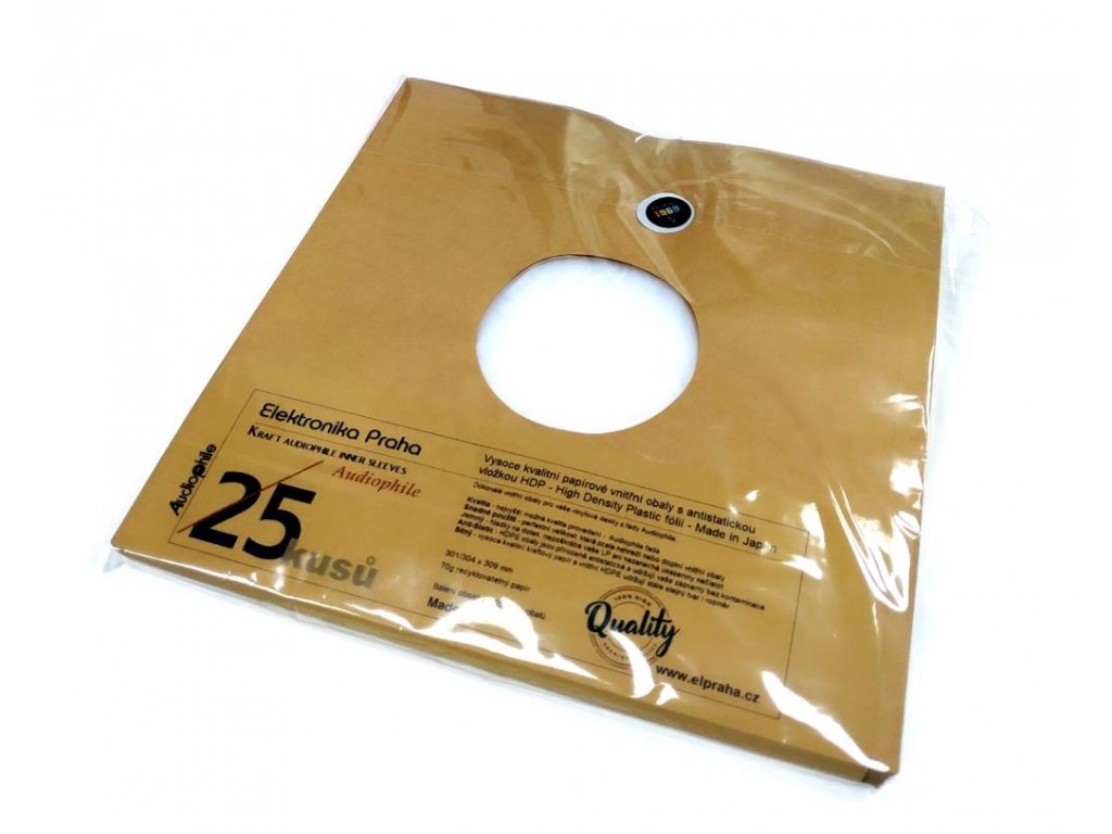 Značka Elektronika Praha je s vámi od roku 1969 a po celou dobu ji reprezentuje typické, elegantní i nadčasové logo, které vzniklo díky kreativitě původního člena hospodářského sdružení, jenž upravil na osciloskopu vykreslený průběh nejrychlejšího signálu do vyobrazené podoby evokující zároveň mechanickou kliku. Logo tak nese informaci, že jde o elektronické produkty vyráběné s vysokým podílem ruční práce. Díky tomu lze říci: máte kliku, že při tvorbě produktů aplikujme typickou českou chytrost a šikovnost, již 55 let máte kliku, že většinu produktů vyrábíme v EU máte kliku, že produkty poskytují mimořádný poměr užitné hodnoty k ceně, možná ten nejlepší na trhu Vysoce kvalitní papírové vnitřní obaly s antistatickou vložkou v sadě 25 kusů - Kraft Audiophile Řada Audiophile - s důrazem na vysoký standard provedení a kvalitní materiály Dokonalé vnitřní obaly pro vaše vinylové desky z řady Audiophile. - Kvalita - nejvyšší možná kvalita provedení - Audiophile řada- Snadné použití - perfektní velikost, která zcela nahradí nebo doplní vnitřní obaly- Jemný - hladký na dotek, nepoškrábe vaše LP ani nezanechá usazeniny nečistot- Anti-Static - HDPE obaly jsou přirozeně antistatické a udržují vaše záznamy bez kontaminace - Silný- vysoce kvalitní HDPE udržuje stále stejný tvar i rozměr Tyto gramofonové obaly od EP Audiophile nabízejí vysoce kvalitní, ale cenově dostupnou náhradu za originální papírové obaly S vnitřní vložkou z antistatické HDP - High Density Plastic fólie - Made in Japan HDP zabraňuje pronikání prachu z papíru do povrchu desky s antistatickým účinkem Vysoká kvalita provedení i použitých materiálů Vysoká odolnost vůči protržení, tvarově stálý Vnitřní obaly jsou vhodné pro archivaci LP vinylových desek Odolné proti UV záření a chrání tak umělecká díla před vyblednutím času Snadné vkládání vinylu Neobsahuje žádná změkčovadla,která by mohla reagovat s vinylem Snadné vkládání LP desky díky prodlouženému zadnímu okraji Kvalitní kraftový papír s vysokou pevností s nízkou hladinou ligninu Nejšetrnější ukládání gramofonových desek s ochranou proti poškrábání a se snížením antistatického náboje 301/304 x 309 mm 70g papír Recyklovatelný Cena za 25 kusů 1 balení obsahuje 25 kusů obalů Made in EU Barevné provedení papírových obalů: přírodní / kraftový papírDoplňkové parametry