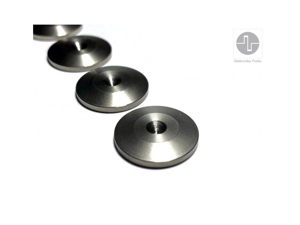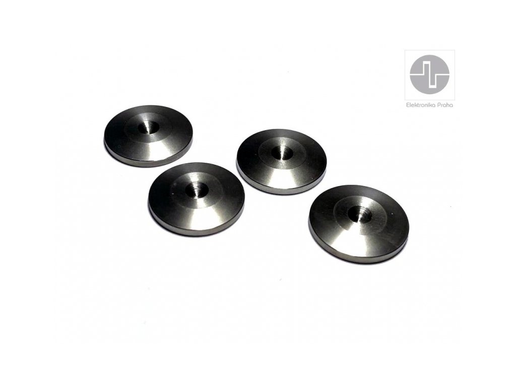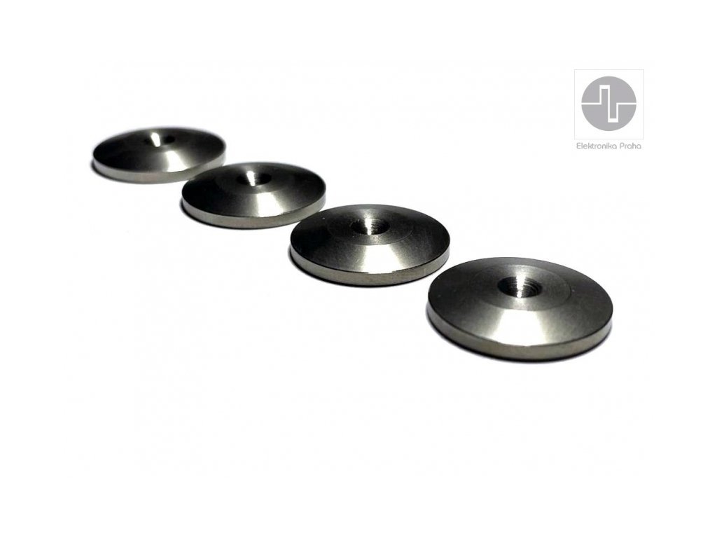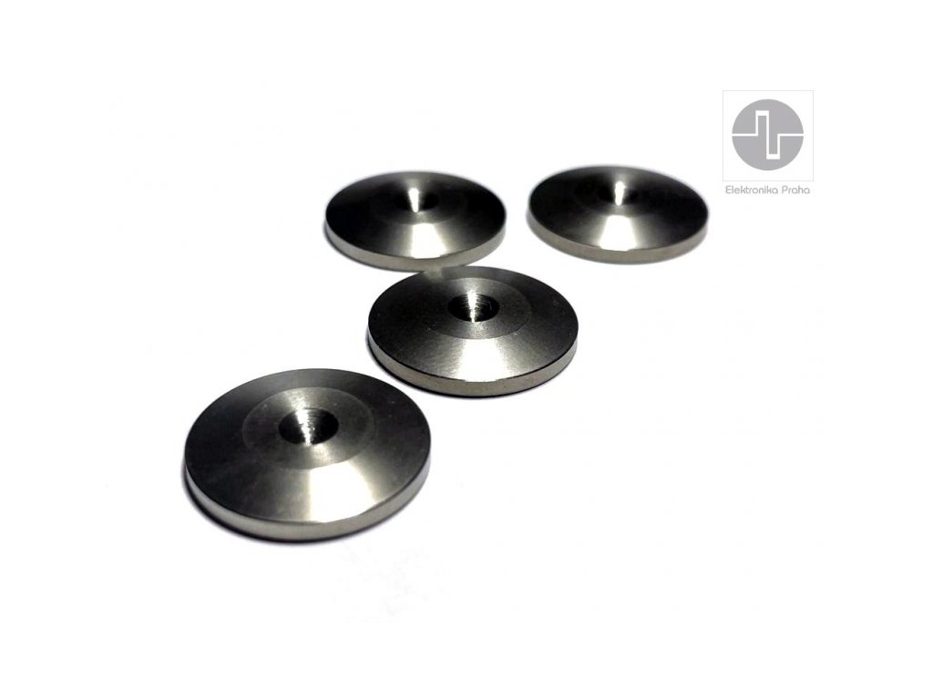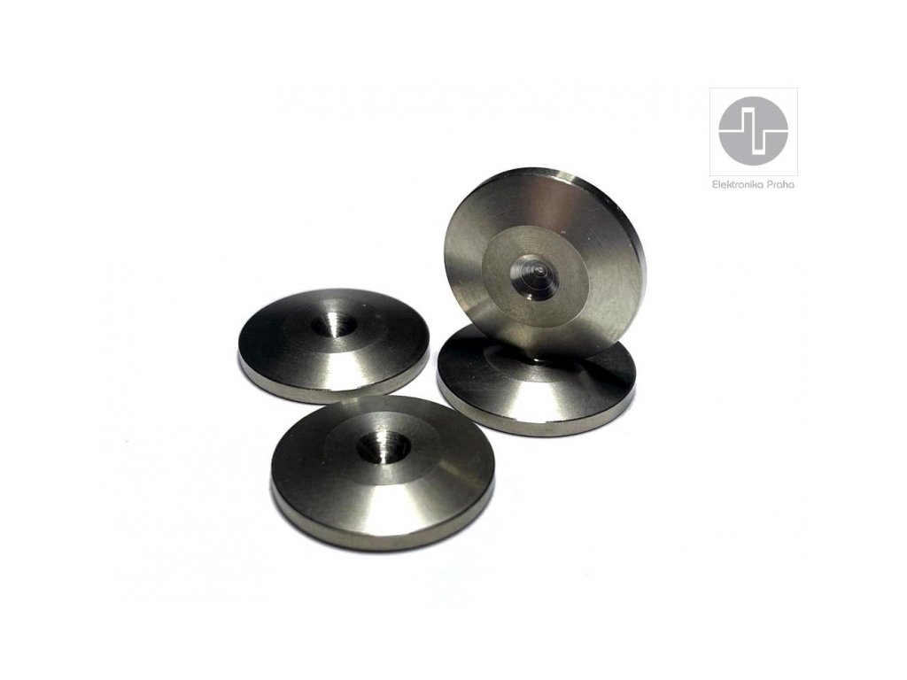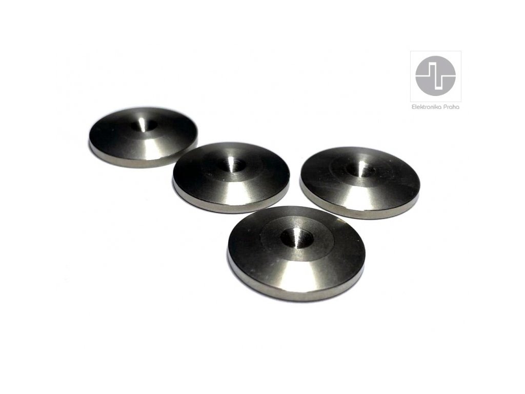 Značka Elektronika Praha je s vámi od roku 1969 a po celou dobu ji reprezentuje typické, elegantní i nadčasové logo, které vzniklo díky kreativitě původního člena hospodářského sdružení, jenž upravil na osciloskopu vykreslený průběh nejrychlejšího signálu do vyobrazené podoby evokující zároveň mechanickou kliku. Logo tak nese informaci, že jde o elektronické produkty vyráběné s vysokým podílem ruční práce. Díky tomu lze říci: máte kliku, že při tvorbě produktů aplikujme typickou českou chytrost a šikovnost, již 55 let máte kliku, že většinu produktů vyrábíme v EU máte kliku, že produkty poskytují mimořádný poměr užitné hodnoty k ceně, možná ten nejlepší na trhu Universální podložky pod odhmotňovací hroty reprosoustav a audio komponentů / 20mm / chirurgická ocel / Solid Steel Universální podložky pod odhmotňovací hroty reprosoustav a audio komponentů / 20mm / chirurgická ocel: CD přehrávače, gramofony, zesilovače, reprosoustavy ... Průměr: 20mm Výška: 3.5mm Kvalitní zpracování - chirurgická ocel * Kvalitní a přesné CNC zpracování Sada obsahuje 4 kusy Made in EU * Chirurgická ocel: Chirurgická ocel je velmi odolný a tvrdý materiál. Je to také hypoalergenní kov, nevyvolává tudíž žádné alergické reakce a neuvolňuje žádné niklové soli. Velikou předností chirurgické oceli je, že neoxiduje, má proto stálou barevnost a na povrchu se tak netvoří nežádoucí skvrny. Odolá vlivům mořské vody a slunce. Nikdy a za žádných okolnostech neztrácí svůj původní vzhled. Chirurgická ocel je díky svým vlastnostem odolná vůči poškrábání a poškození a udržuje si svůj lesk.Doplňkové parametry