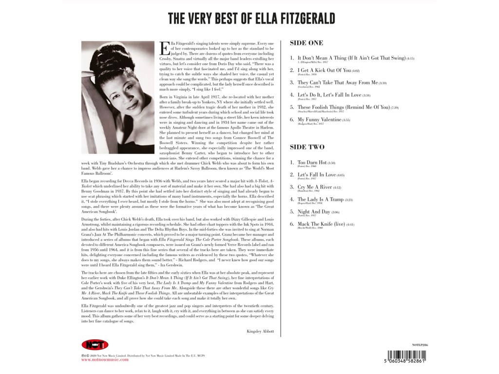 180G Blue Vinyl LP / 2020 Pěvecké schopnosti Elly Fitzgerald byly zkrátka mimořádné. Všichni z jejích současníků k ní vzhlíželi jako ke standardu, podle kterého měli být hodnoceni. Existují desítky citátů od všech, včetně Crosbyho, Sinatry a prakticky všech významných kapelníků, kteří vychvalují její ctnosti. Ella Fitzgerald byla nepochybně jednou z největších jazzových a popových zpěvaček a interpretů dvacátého století. Posluchači mohou na její hudbu tančit, relaxovat, smát se, plakat a vše mezi tím, protože umí uspokojit každou náladu. Toto album shromažďuje některá z jejích nejlepších nahrávek a mohlo by sloužit jako výchozí bod pro hlubší ponoření se do jejího výjimečného katalogu písní. SIDE ONE 1. It Don’t Mean A Thing (If It Ain’t Got That Swing)2. I Get A Kick Out Of You3. They Can’t Take That Away From Me4. Let’s Do It, Let’s Fall In Love5. These Foolish Things (Remind Me Of You)6. My Funny Valentine SIDE TWO 1. Too Darn Hot2. Let’s Fall In Love3. Cry Me A River4. The Lady Is A Tramp5. Night And Day6. Mack The Knife (live)Doplňkové parametry