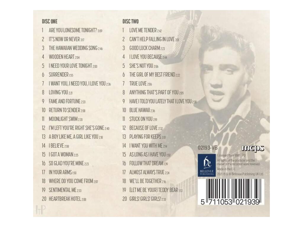 Phonographic Copyright ℗ – Bellevue Publishing Uk Ltd Copyright © – Bellevue Publishing Uk Ltd DISC ONE 1 ARE YOU LONESOME TONIGHT? 3:09 2 IT'S NOW OR NEVER 3:173 THE HAWAIIAN WEDDING SONG 2:464 WOODEN HEART 2045 I NEED YOUR LOVE TONIGHT 2:006 SURRENDER 1:557 I WANT YOU, I NEED YOU, I LOVE YOU 2:368 LOVING YOU 2:219 FAME AND FORTUNE 2:3310 RETURN TO SENDER 2:0811 MOONLIGHT SWIM 2:2012 I'M LEFT YOU'RE RIGHT SHE'S GONE 2:4013 A BOY LIKE ME, A GIRL LIKE YOU 2:1814 I BELIEVE 2:0815 I GOT A WOMAN 2:2516 SO GLAD YOU'RE MINE 22317 IN YOUR ARMS 1:5018 WHERE DO YOU COME FROM 20719 SENTIMENTAL ME 23320 HEARTBREAK HOTEL 2:08 DISC TWO 1 LOVE ME TENDER 2:422 CAN'T HELP FALLING IN LOVE 3013 GOOD LUCK CHARM 2:234 I LOVE YOU BECAUSE 2:445 SHE'S NOT YOU 2:066 THE GIRL OF MY BEST FRIEND 2:227 TRUE LOVE 2068 ANYTHING THAT'S PART OF YOU 2:059 HAVE I TOLD YOU LATELY THAT I LOVE YOU 2:3010 BLUE HAWAII 2:3611 STUCK ON YOU 2:1912 BECAUSE OF LOVE 2:3213 PLAYING FOR KEEPS 3:0114 I WANT YOU WITH ME 2:1415 AS LONG AS I HAVE YOU 1:5016 FOLLOW THAT DREAM 1:3917 ALMOST ALWAYS TRUE 22418 WE'LL BE TOGETHER 21619 (LET ME BE YOUR) TEDDY BEAR 1:5320 GIRLS! GIRLS! GIRLS! 2:33Doplňkové parametry