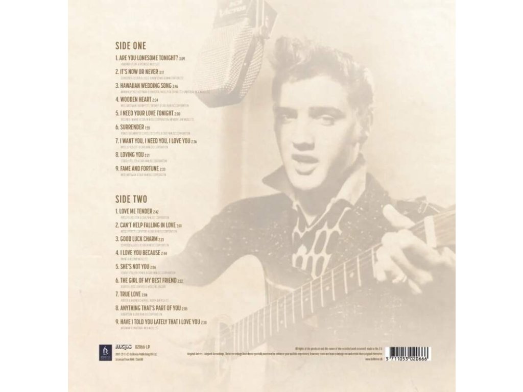 Elvis Presley - Elvis In Love Bellevue Entertainment 180g, Reference master vinyl, Limited edition, 100 % analogové album s referenční zvukovou kvalitou- Analog Experience Exkluzivní obal a příslušenství podtrhuje výjimečnost těchto nahrávek od Bellevue Entertainment Phonographic Copyright ℗ – Bellevue Publishing Uk Ltd Copyright © – Bellevue Publishing Uk Ltd SIDE ONE:1. Are You Lonesome Tonight? 2. It’s Now or Never 3. Hawaiian Wedding Song 4. Wooden Heart 5. I Need Your Love Tonight 6. Surrender 7. I Want You, I Need You, I Love You 8. Loving You 9. Fame And Fortune SIDE TWO:1. Love Me Tender 2. Can’t Help Falling In Love 3. Good Luck Charm 4. I Love You Because 5. She’s Not You 6. The Girl Of My Best Friend 7. True Love 8. Anything That’s Part Of You 9. Have I Told You Lately That I Love You ÚLOŽNÝ PROSTOR Vinylové desky jsou citlivé na nízké a vysoké teploty. Vinylové desky byste nikdy neměli vystavovat teplotám nižším než minus 5 stupňů nebo vyšším než 30 stupňů Celsia. Vždy se vyhněte přímému slunečnímu záření a vinylové desky skladujte ve svislé poloze a nikdy je neskládejte na sebe.Doplňkové parametry