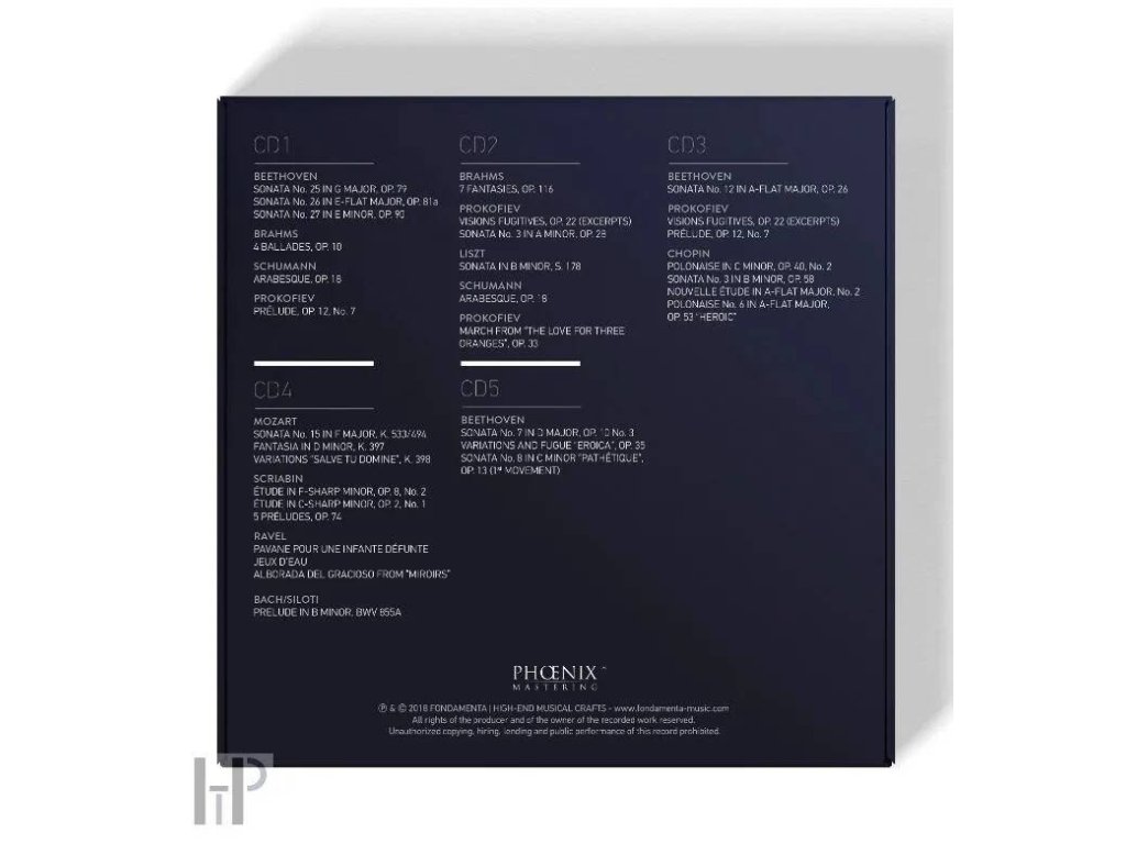 "V červnu 2017, když jsem měl vystoupit v Moskvě, jsem se setkal s Kirillem Gilelsem, vnukem slavného pianisty Emila Gilelse. Poslouchal, co může náš proces restaurování Phoenix Mastering dosáhnout, a dal nám seznam let a míst, kde žil jeho dědeček. nepublikované nahrávky. V Berlíně, Moskvě, Petrohradu objevujeme dědictví, které nás udivuje kvalitou a stálostí klavírní hry Emila Gilelse. Nepochybně stojíme před jedním z největších hudebníků 20. století. Konečně to bylo v Amsterdamu Díky odhodlání Pieta Tullenaara se nám podařilo získat pět recitálů, které klavírista přednesl v letech 1975 až 1980 v Concertgebouw a na jejichž existenci všichni zapomněli. Když jsme ve studiu, které nám bylo přiděleno, zkoušeli kazety jednu po druhé, ani Piet Tullenaar, ani Michel Navarra, ani já jsme neprohodili slovo. Jaká krása! F. D’Oria-Nicolas RECORD 1 Beethoven : Sonata No. 25 in G Major, Op.79 Presto alla tedesca Andante Vivace Beethoven : Sonata No. 27 in E Minor, Op. 90 Mit Lebhaftigkeit und durchaus mit Empfindung und Ausdruck Nicht zu geschwind und sehr singbar vorgetragen Beethoven : Sonata No. 26 in E-flat Major “Les Adieux”, Op. 81a Das Lebewohl (Adagio – Allegro) Abwesenheit (Andante espressivo) Das Wiedersehen (Vivacissimamente) Schumann : Arabesque, Op. 18 RECORD 2 Brahms : 4 Ballades, Op. 10 Ballade No. 1 in D Minor "Edward" Ballade No. 2 in D Major Ballade No. 3 in B Minor “Intermezzo” Ballade No. 4 in B Major Brahms : Fantasies, Op. 116 Capriccio in D Minor: Presto energico Intermezzo in A Minor: Andante Capriccio in G Minor: Allegro passionato Intermezzo in E Major: Adagio Intermezzo in E Minor: Andante con grazia ed intimisso sentimento Intermezzo in E Major: Andantino teneramente Capriccio in D Minor: Allegro agitato RECORD 3 Beethoven : Sonata No. 12 in A-flat Major, Op. 26 Andante con variazioni Scherzo: Allegro molto Marcia funebre sulla morte d’un Eroe: Maestoso andante Allegro Prokofiev : Visions Fugitives, Op. 22 (excerpts) No. 1, Lentamente No. 3, Allegretto No. 5, Molto giocoso No. 7, Pittoresco No. 8, Commodo No. 10, Ridicolosamente No. 11, Con vivacità No. 17, Poetico Prokofiev : Prélude, Op. 12, No. 7 Prokofiev : Sonata No. 3 in A Minor, Op. 28 Prokofiev : March from “The Love for Three Oranges“, Op. 33 RECORD 4 Chopin : Polonaise in C Minor, Op. 40, No. 2 Chopin : Sonata No. 3 in B Minor, Op. 58 Allegro maestoso Scherzo: Molto vivace Largo Finale: Presto ma non tanto Chopin : Nouvelle Étude in A-flat Major, No. 2 Chopin : Polonaise No. 6 in A-flat Major, Op. 53 "Heroic" RECORD 5 Mozart : Piano Sonata No. 15 in F Major, K. 533/494 Allegro Andante Rondo: Allegretto Mozart : Fantasia in D Minor, K. 397 Mozart : Variations on "Salve tu Domine" from "I filosofi immaginari" by Paisiello, K. 398 RECORD 6 Scriabin : Étude in C-sharp Minor, Op. 2, No. 1 Scriabin : Étude in F-sharp Minor, Op. 8, No. 2 Scriabin : 5 Préludes, Op. 74 No. 1 (Douloureux, déchirant) No. 2 (Très lent, contemplatif) No. 3 (Allegro dramatico) No. 4 (Lent, vague, indécis) No. 5 (Fier, belliqueux) Ravel : Pavane pour une infante défunte Ravel : Jeux d’eau Ravel : Alborada del gracioso from “Miroirs” Bach/Siloti : Prelude in B Minor, BWV 855A RECORD 7 Beethoven : Sonata No. 7 in D Major, Op. 10, No. 3 Presto Largo e mesto Menuetto: Allegro Rondo: Allegro Beethoven : Variations and Fugue in E-flat Major “Eroica”, Op.35 Introduzione col basso del tema: Allegretto vivace Tema Variation No. 1 Variation No. 2 Variation No. 3 Variation No. 4 Variation No. 5 Variation No. 6 Variation No. 7 Canone all’ottava Variation No. 8 Variation No. 9 Variation No. 10 Variation No. 11 Variation No. 12 Variation No. 13 Variation No. 14 Minore Variation No. 15 Maggiore. Largo Coda Finale: Alla fuga Emil Gilels, piano Enregistré au Concertgebouw, Netherlands19.I.197526.X.197629.III.197830.I.197915.IV.1980STEREO ℗ 1975 TROSSTEREO ℗ 1976 NOSSTEREO ℗ 1978 KROSTEREO ℗ 1979 NOSSTEREO ℗ 1980 NOS Remastérisé par ℗ & © 2018 FONDAMENTAFabriqué et imprimé en Allemagne Remasterisé à partir des bandes analogiques originales5CD boxsetDoplňkové parametry