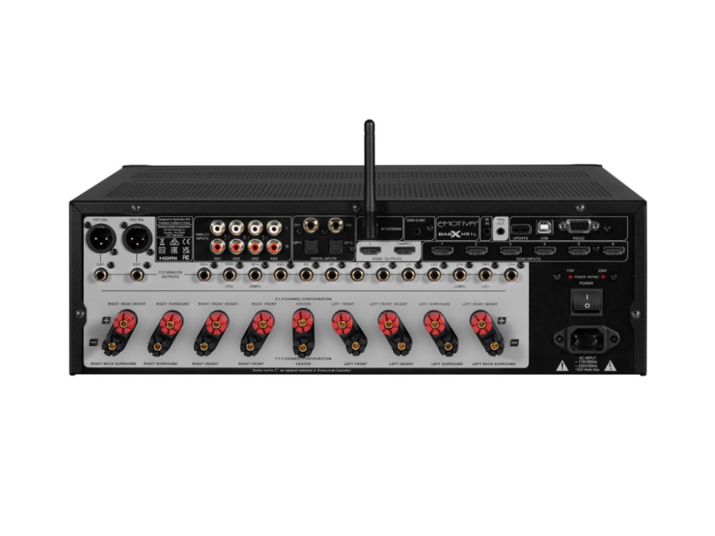 Emotiva BasX MR1L 9.2 kanálový Dolby Atmos a DTS:X™ Cinema receiver BasX MR1 cinema receiver kombinuje vysoce výkonný 13.2 kanálový procesor prostorového zvuku a 9 kanálový zesilovač. Část procesoru podporuje 4K UHD video, včetně HDR a Dolby Vision, enhanced ARC (eARC) a nejnovějších Dolby Atmos® a DTS:X™ formátů prostorového zvuku. MR1L má 6 HDMI 2.0b video vstupů, s podporou 4K UHD HDR videa a enhanced ARC (eARC). Součástí MR1L je měřicí mikrofon a nejnovější verze EmoQ, našeho uznávaného systému pro automatickou korekci akustiky místnosti. MR1L také nabízí více analogových a digitálních audio vstupů a vestavěný Bluetooth přijímač s podporou aptX.Část zesilovače kombinuje 9 kanálů audiofilní třídy A/B. Zesilovač je napájen výkonným 660 VA toroidním transformátorem, který zajišťuje vynikající kvalitu zvuku a chladný, spolehlivý provoz. MR1L si zachovává naprostou kontrolu i při náročném zatížení a nízkoimpedančních reproduktorech, kde méně výkonné přijímače doslova „lapají po dechu“. MR1L také nabízí kompletní sadu linkových výstupů předzesilovače ve formátu 13.2 kanálů. Samozřejmě je možné zcela deaktivovat zesilovací část, pokud chcete MR1L používat jako samostatný procesor prostorového zvuku. BasX MR1L je pravý audiofilní komponent navržen a sestaven profesionály, aby poskytoval vynikající výkon, který ocení jak audiofilové, tak příležitostní posluchači. MR1L také nabízí vysokorychlostní přepínání, které směruje video obsah přímo z vybraného vstupu do výstupu bez jakéhokoli nadbytečného zpracování, což zajišťuje, že budete i nadále získávat absolutně nejlepší možnou kvalitu obrazu z vašich HD a 4K UHD video zdrojů spolu s podporou ARC a Enhanced eARC. BasX MR1L poskytuje skutečně špičkový obrazový i poslechový zážitek s neuvěřitelným výkonem, vysokou kvalitou zpracování a snadným ovládáním. Vlastnosti: Podpora aktuálních formátů prostorového a imerzního zvuku, včetně Dolby TrueHD, DTS HD Master Audio, Dolby Atmos® a DTS:X™. Podpora jak standardního ARC (Audio Return Channel), tak i vylepšeného eARC (Enhanced ARC). Vynikající kvalita zvuku díky pokročilým dekodérům prostorového zvuku a vysoce optimalizované analogové audio elektronice. Linkové audio výstupy na MR1L podporují až třináct hlavních a prostorových kanálů plus až dva subwoofery. Reproduktorové výstupy na MR1L mohou napájet až 9 kanálů reproduktorů v různých konfiguracích, včetně až sedmi hlavních a prostorových reproduktorů a jednoho páru výškových kanálů, nebo až pěti hlavních a prostorových reproduktorů a dvou párů výškových kanálů. Výjimečná kvalita videa s rychlým a bezchybovým přepínáním až šesti HDMI vstupů – všechny podporují HDMI 2.0b a HDCP 2.2, 4K UHD video a HDR (včetně HDR10, HDR10+ a Dolby Vision). Vestavěný Bluetooth přijímač s podporou AptX-HD pro streamování zvuku ze smartphonu a dalších mobilních zařízení. Emo-Q™ pokročilý systém automatické korekce akustiky místnosti automaticky kalibruje MR1L pro optimální kvalitu zvuku ve vaší poslechové místnosti (součástí je kalibrační měřicí mikrofon s vestavěným zesilovačem). Přehled o aktuálním stavu v reálném čase díky přednímu VFD displeji a praktickému obrazovkovému menu. Pohodlné ovládání: plně vybavené podsvícené infračervené dálkové ovládání, navigační tlačítka menu na předním panelu a klasické otočné tlačítko hlasitosti. Výkonný lineární napájecí zdroj napájený masivním toroidním transformátorem. Provoz na 115 V nebo 230 V s automatickým rozpoznáním a přepínáním napájecího napětí. Součástí balení je infračervené dálkové ovládání s přímým výběrem audio a video zdrojů jedním tlačítkem, přístupem do menu systému MR1L a podsvícenými měkkými tlačítky. Více možností dálkového ovládání – včetně rozhraní RS-232. Aktualizace firmwaru přes USB flash disk – bez nutnosti připojení k počítači. Kompaktní rozměry a moderní vzhled usnadňují umístění MR1L prakticky v jakékoli místnosti nebo audio stojanu. Kompletní tříletá záruka Emotiva.Doplňkové parametry