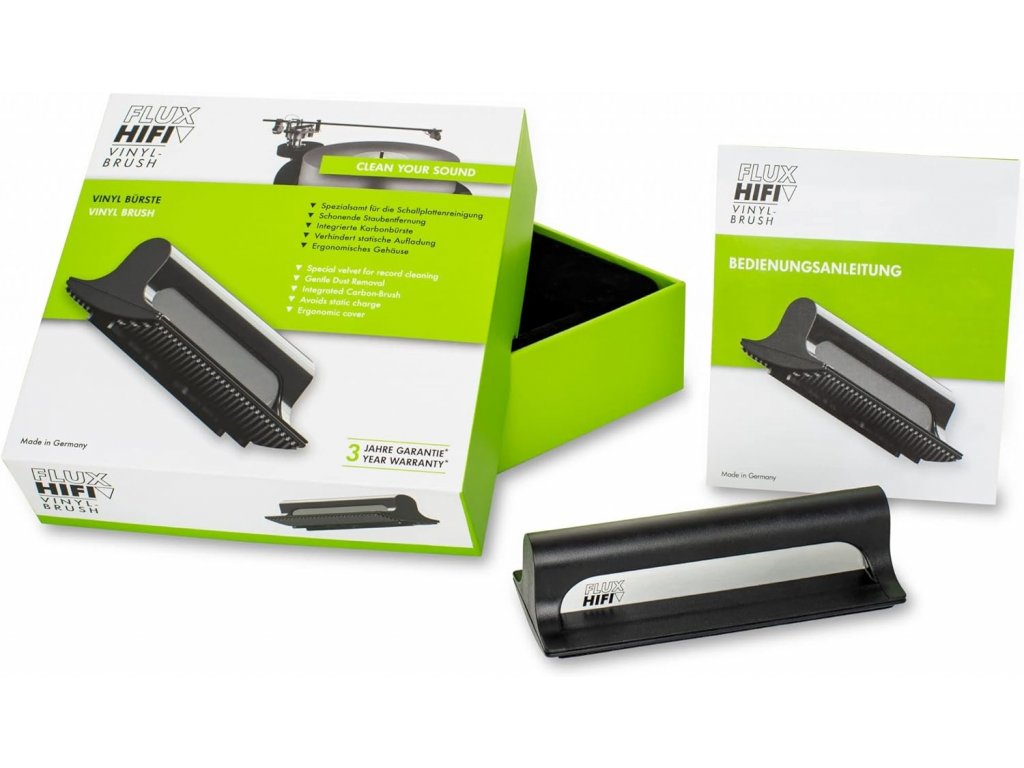 FLUX Hifi Carbon Brush byl vyvinut k odstranění povrchového prachu a statického náboje z desky na gramofonu. Zcela nový design kombinuje sametové polštářky s integrovaným kartáčkem z uhlíkových vláken. Speciální samet s hlubokým vlasem zajišťuje důkladné čištění povrchu panelu a úplné odstranění prachových částic. Nejšetrnější odstranění prachu Speciální samet pro čištění desek Uhlíková velmi jemná a hustá vlákna Eliminuje tvorbu statického náboje Ergonomický kryt pro snadné uchycení a manipulaci Made in Germany Pouze takto kvalitní kartáč z uhlíkových vláken zabraňuje tomu, aby se deska stala statickou. To minimalizuje praskání, následné zkreslení a zabraňuje dalšímu ulpívání prachu na povrchu LP. Pouze pokud je LP bez prachu, může snímací systém snímat záznam bez šumu a zkreslení.K čištění jehly doporučujeme FLUX-Sonic, náš inovativní elektronický čistič jehel.Doplňkové parametry