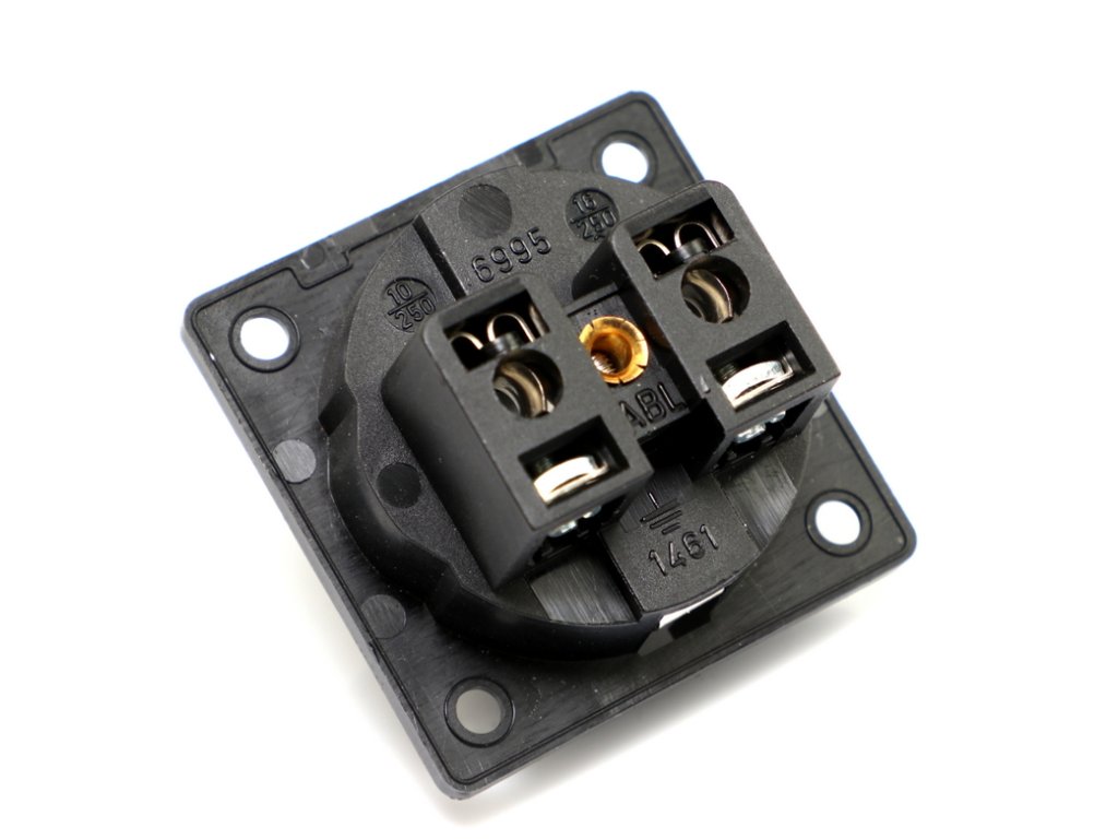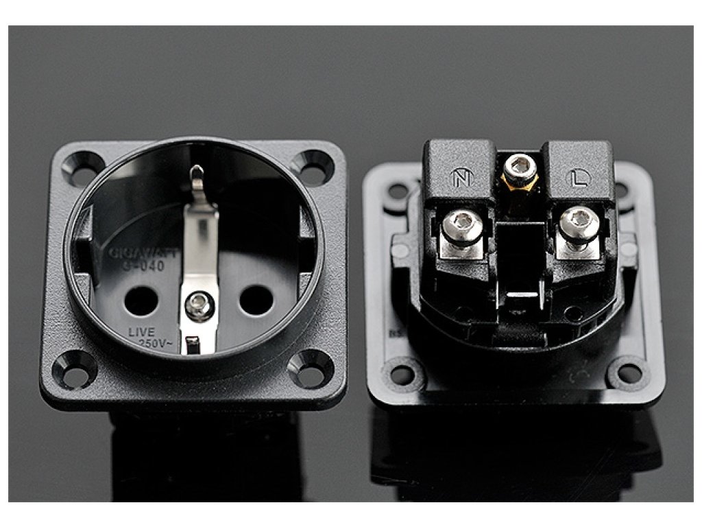 G-040 Schuko je vysoce kvalitní zásuvka určená pro montáž do panelu. Tento produkt pochází z vývoje společnosti GigaWatt. Tato zásuvka je navržena tak, aby mohla být instalována do skříně pro napájecí zařízení, pro kabelové rozvodny, filtry proti rušení nebo kondicionéry. Všude tam, kde je zapotřebí bezpečného, spolehlivého připojení a bezstratové distribuce napájení. Vyztužené prvky kostry jsou vyrobeny z černého nylonu. Zásuvka je opatřena šroubky pro uchycení vodičů. Mosazné konektory byly přímo potaženy stříbrem bez použití další mezivrstvy. Obvykle je přidána vrstva mědi nebo niklu, ale tím se zvyšuje sériový odpor a tím snižuje napětí. Přímý nástřik se stříbrem minimalizuje spojení na téměř nezměrné úrovně, blížící se absolutní nule, což zlepšuje zvukové schopnosti produktu. Silné, stabilní připojení, větší spojovací plocha a silná stříbrná vrstva. Dále byla zásuvka kryogenně zpracována a demagnetizována. 110-240VAC 50/60Hz 16A 50x50x36mm 0,06kgDoplňkové parametry
