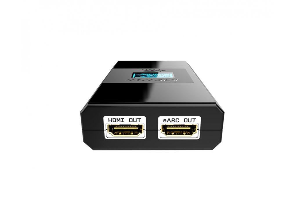 HDFury Arcana – 4K 18Gb/s HDMI eARC Audio De-Embedder HDF0160 Arcana je 4K 18Gb/s HDMI eARC Audio De-Embedder a adaptér, který de-embeduje audio až po Dolby Atmos z jakéhokoli HDMI zdroje do jakéhokoli eARC zvukového systému. Díky tomu jsou televizory s HDMI, které nemají vyhrazený port eARC kompatibilní s jakýmkoli vstupem HDMI eARC. Arcana také odstraňuje běžné problémy s "lip sync" při použití s eARC TV. Představuje tak dokonalé řešení pro Soundbary Sonos Arc nebo Beam 2 i jakékoli jiné eARC AVR nebo soundbary. Podporuje HDCP konverzi (1.4>2.2 / 2.2>1.4) stejně jako CEC. Dostupné jsou také úpravy signálu jako 4K na 1080p downscaling a rozsáhlé EDID funkce. Možnost řízení pomocí RS232 a tlačítek na OLED obrazovce. Co je to a jak funguje eARC? Vlastnosti: eARC extrakce ze vstupu 1 HDMI na výstupy 2 HDMI (eARC / pass-through) Podporuje 18Gb/s pro rozlišení až 4K UltraHD 60Hz HDMI eARC výstup de-embeduje HDMI kompatibilní audio signály až po Dolby Atmos HDCP konverze (1.4>2.2 / 2.2>1.4), downscaling, EDID, úprava signálu Řízení pomocí CEC, RS232 a tlačítek (OLED), upravení HDR metadatDoplňkové parametry