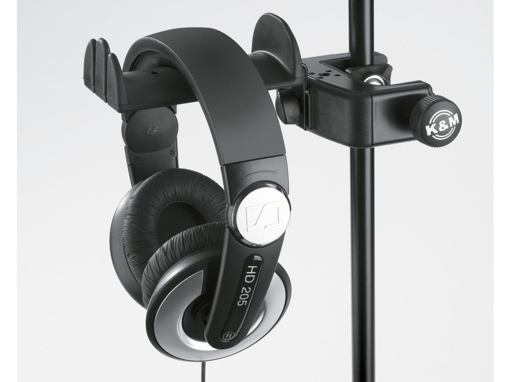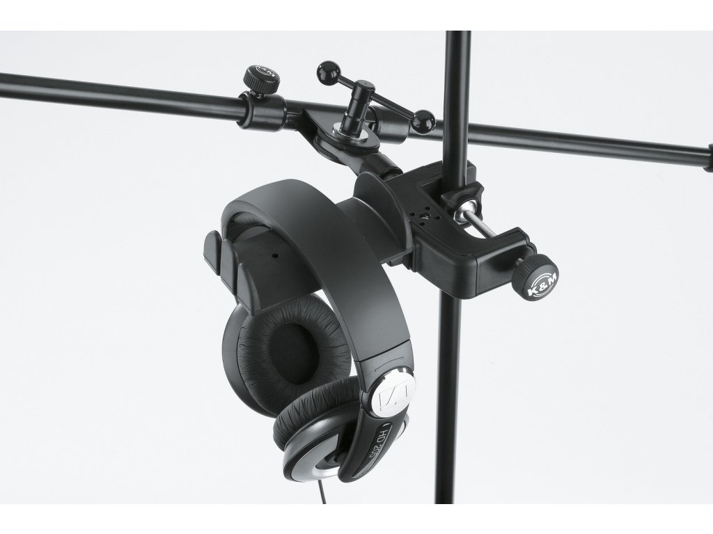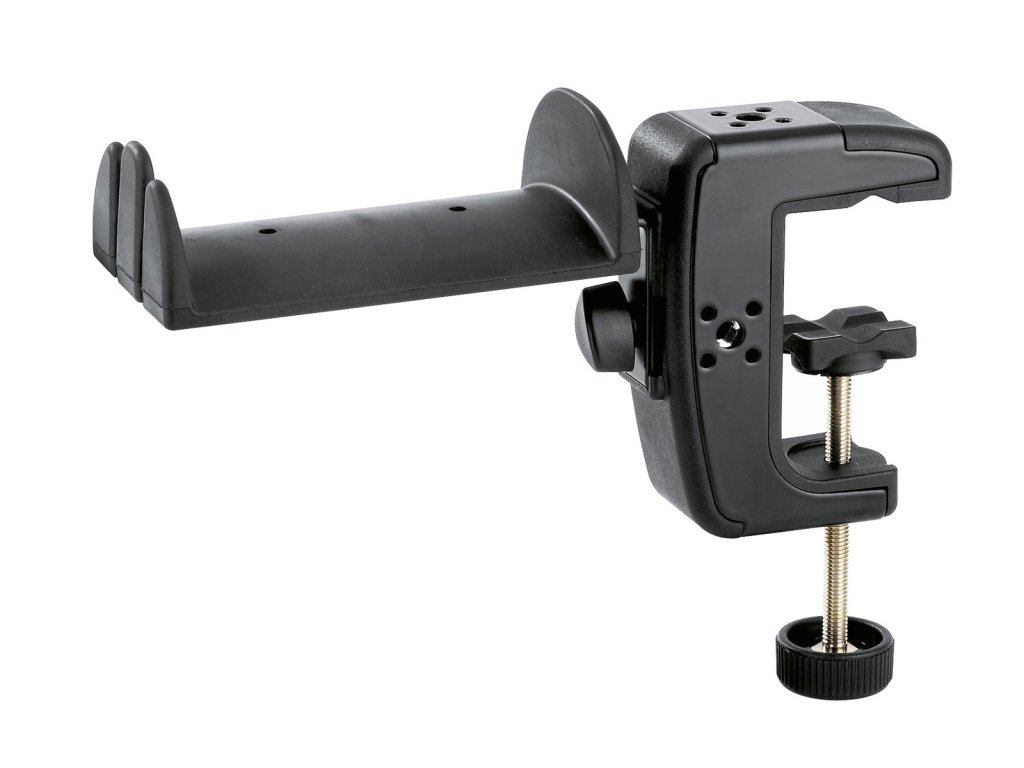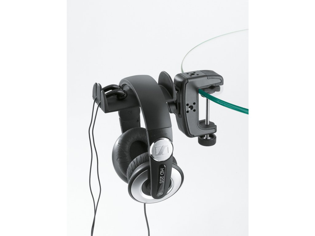 Držák na sluchátka se svorkou pro připevnění ke stolu nebo mikrofonnímu stojanu. Upínací rozsah svorky 0-48 mm. Držák lze otáčet o 90°. Pogumovaný povrch, možnost zavěšení 2 ks standardních sluchátek a 2 ks In-Ear sluchátek. Šířka držáku 100 mm, hloubka 60 mm. Vyrábí se v černé barvě.