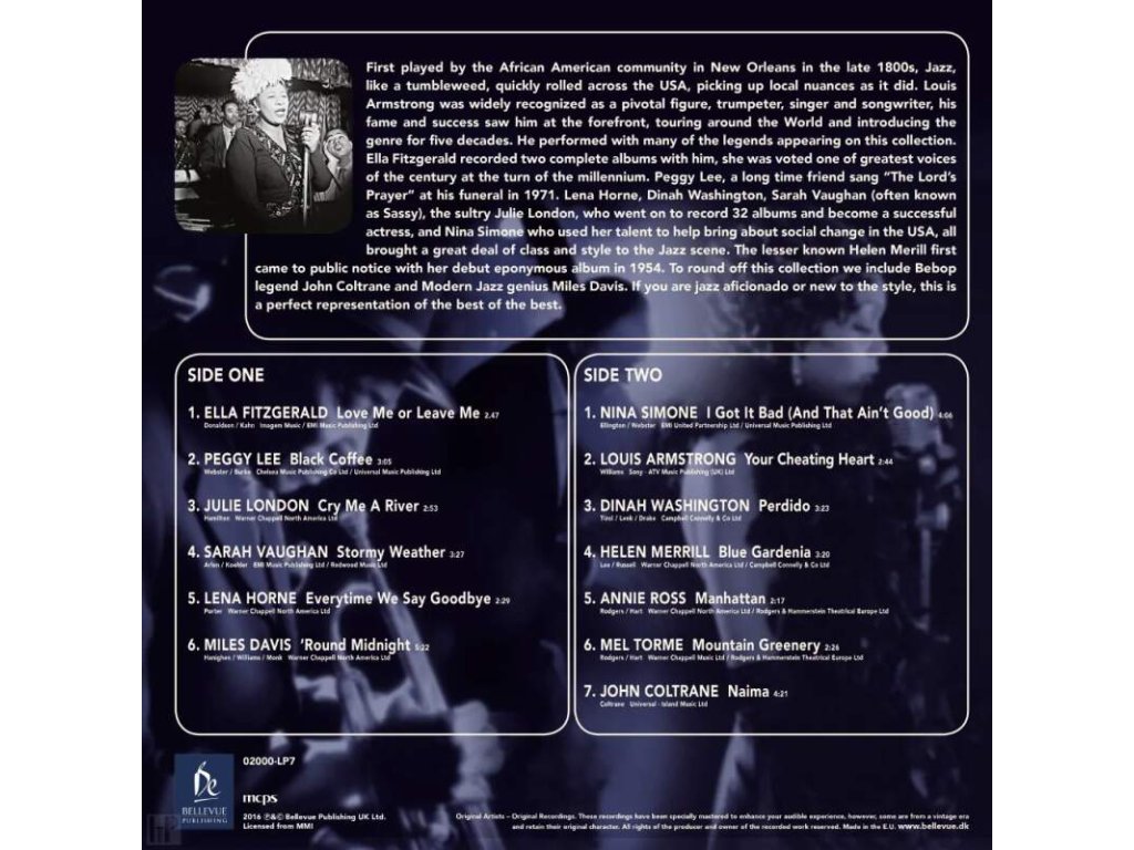 Jazz Masters Bellevue Entertainment 140g, Reference master vinyl, Limited edition, 100 % analogové album s referenční zvukovou kvalitou- Analog Experience Exkluzivní obal a příslušenství podtrhuje výjimečnost těchto nahrávek od Bellevue Entertainment Phonographic Copyright ℗ – Bellevue Publishing Uk Ltd Copyright © – Bellevue Publishing Uk Ltd SIDE 11 ELLA FITZGERALD - LOVE ME OR LEAVE ME2 PEGGY LEE - BLACK COFFEE3 JULIE LONDON - CRY ME A RIVER4 SARAH VAUGHAN - STORMY WEATHER5 LENA HORNE - EVERYTIME WE SAY GOODBYE6 MILES DAVIS - ROUND MIDNIGHT SIDE 2 1 NINA SIMONE - I GOT IT BAD - (AND THAT AIN'T GOOD) 2 LOUIS ARMSTRONG - YOUR CHEATING HEART 3 DINAH WASHINGTON - PERDIDO4 HELEN MERRILL - BLUE GARDENIA5 ANNIE ROSS - MANHATTAN6 MEL TORME - MOUNTAIN GREENERY7 JOHN COLTRANE - NAIMADoplňkové parametry