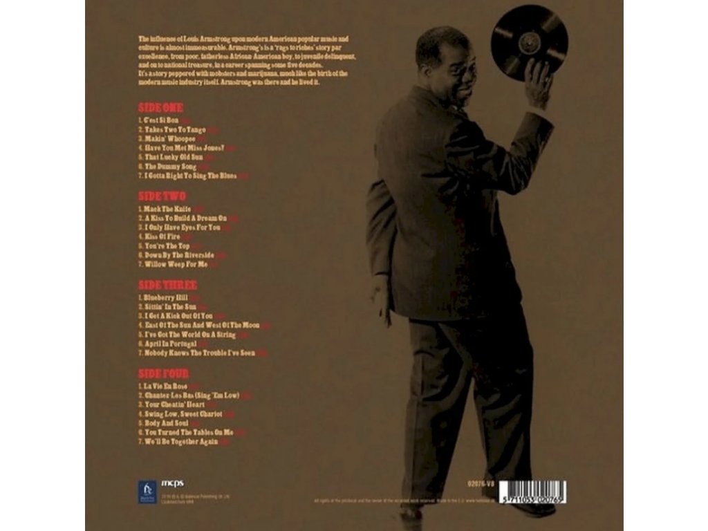 LOUIS ARMSTRONG - Singin’ Satchmo MARATHON MEDIA INTERNATIONAL - Sběratelská řada LP 2LP 180g, Reference master vinyl, Limited edition, 100 % analogové album s referenční zvukovou kvalitou- Analog Experience Exkluzivní obal a příslušenství podtrhuje výjimečnost těchto nahrávek od Bellevue Entertainment A1 C'est Si Bon 3:04 A2 Takes Two To Tango 3:54 A3 Makin' Whoopee 4:57 A4 Have You Met Miss Jones? 4:37 A5 That Lucky Old Sun 3:10 A6 The Dummy Song 2:23 A7 I Gotta Right To Sing The Blues 3:52 B1 Mack The Knife 3:20 B2 A Kiss To Build A Dream On 4:03 B3 I Only Have Eyes For You 5:13 B4 Kiss Of Fire 4:05 B5 You're The Top 3:37 B6 Down By The Riverside 3:09 B7 Willow Weep For Me 4:17 C1 Blueberry Hill 2:58 C2 Sittin' In The Sun 4:01 C3 I Get A Kick Out Of You 4:29 C4 East Of The Sun And West Of The Moon 3:13 C5 I've Got The World On A String 2:50 C6 April In Portugal 2:42 C7 Nobody Knows The Trouble I've Seen 3:00 D1 La Vie En Rose 3:25 D2 Chantez-Les Bas (Sing 'Em Low) 4:49 D3 Your Cheatin' Heart 2:44 D4 Swing Low, Sweet Chariot 3:08 D5 Body And Soul 4:40 D6 You Turned The Tables On Me 2:36 D7 We'll Be Together Again 4:03Doplňkové parametry