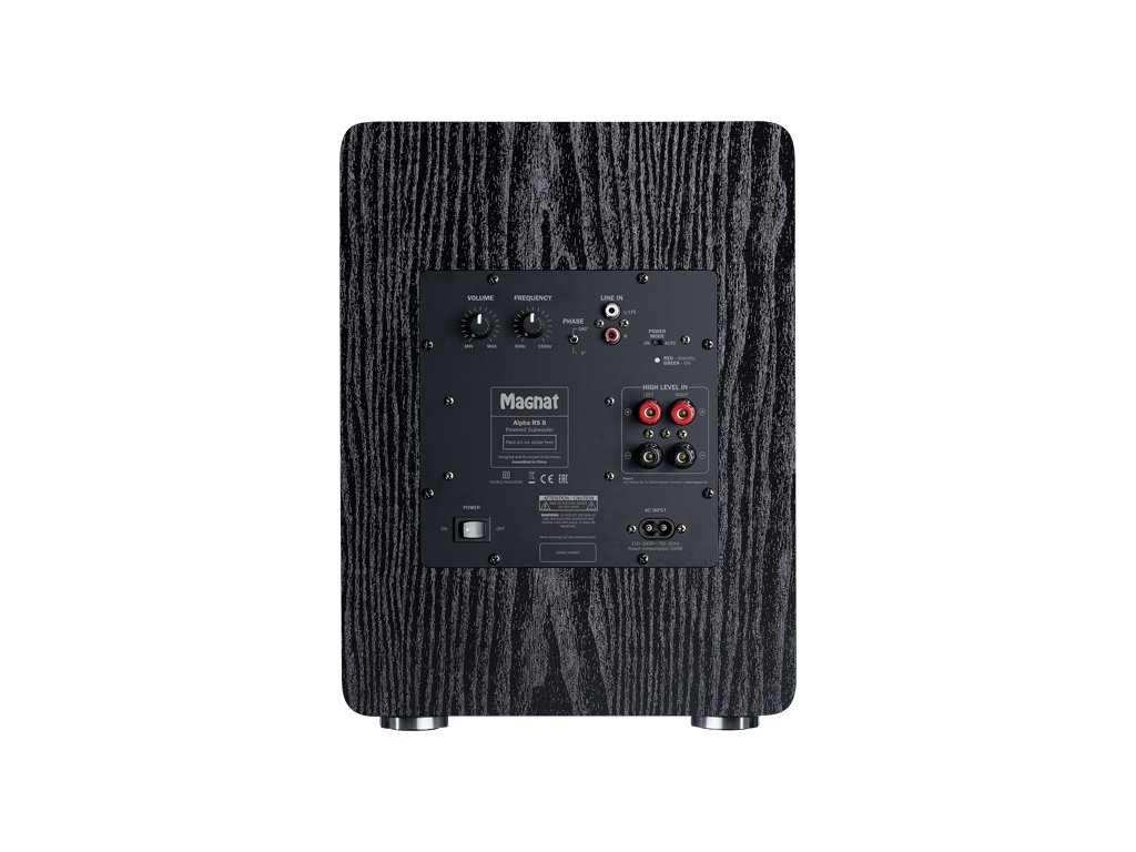 Alpha RS 8 Aktivní subwoofer Alpha RS 8 je osazen 200 mm měničem, který je optimalizová n systé mem Klippel k dosažení nejlep&scaron í ch parametrů. Ozvučnice je z MDF, krycí čelní mří žka je odjí matelná . Na čelní desce je také dvojice bassreflexový ch portů. Subwoofer je osazen antirezonanční mi podložkami. Subwoofer pracují cí ve tří dě D je osazen na zadní desce subwooferu. Nastavit můžete hlasitost, kmitočtový ořez, přepí nat fá zi mezi 0/180. Zesilovač má jak low-level vstup, tak i high-level vstup(pro připojení reproduktorové ho vý stupu ze zesilovače). Funkce stand-by má ní zkou spotřebu kolem 0.5Watt.Doplňkové parametry
