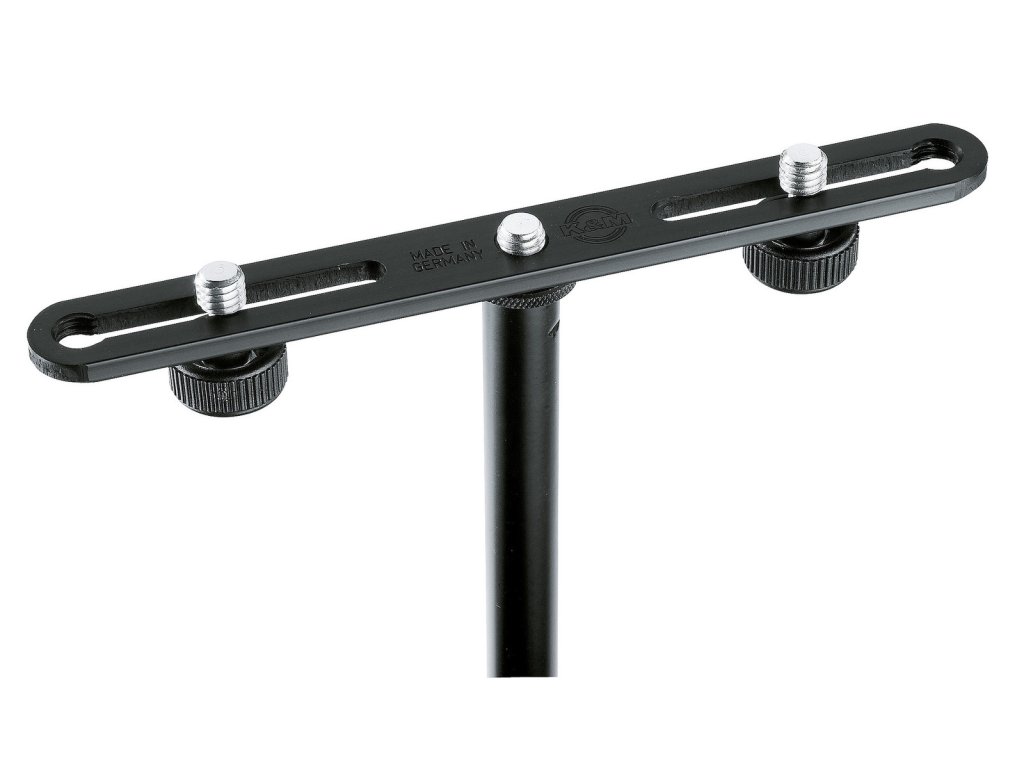 Mikrofonní adaptér pro upevnění 2 mikrofonů nebo mikrofonních ramen. Šrouby se závitem 3/8". Délka adaptéru 200 mm. Nastavitelná rozteč otvorů 60/172 mm. Vyrábí se v černé barvě.