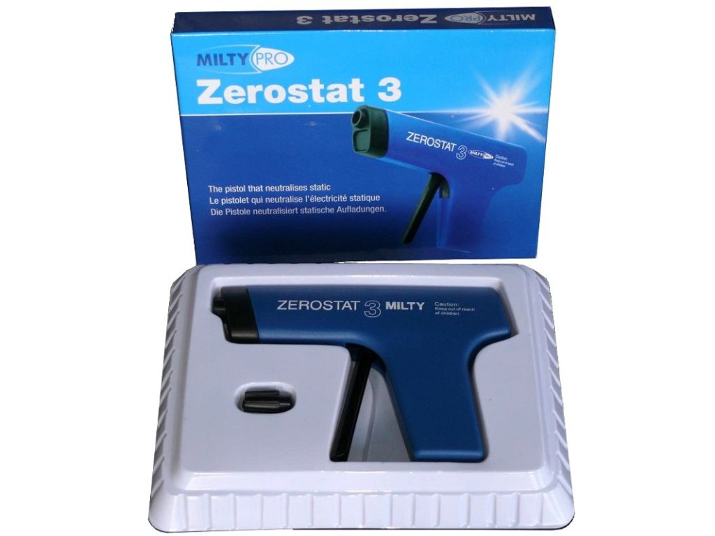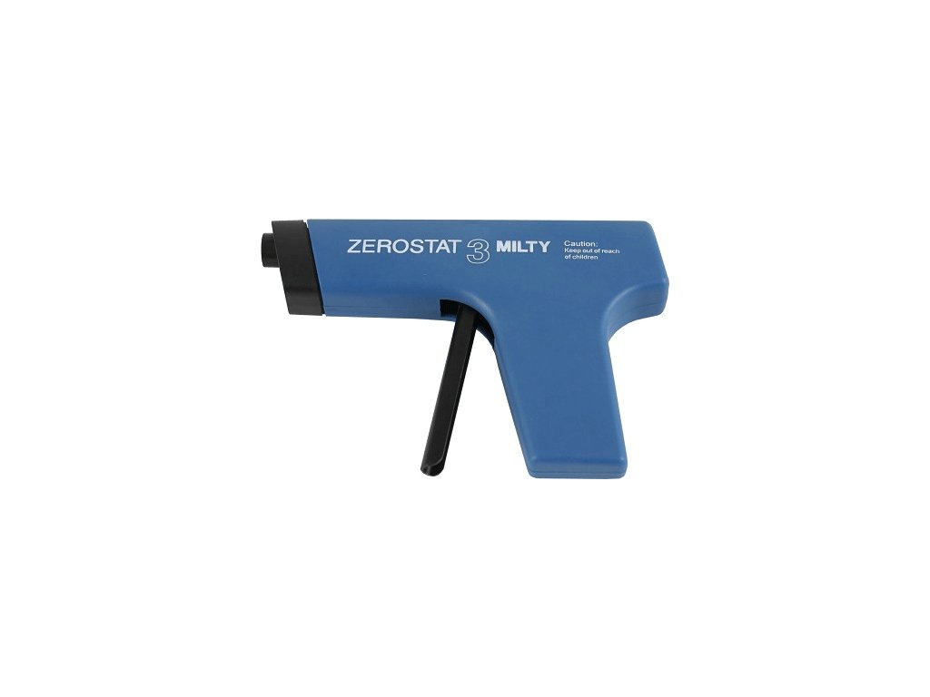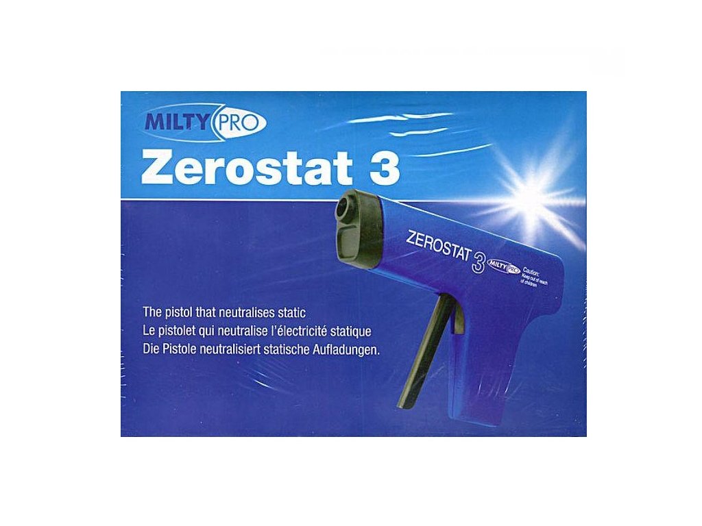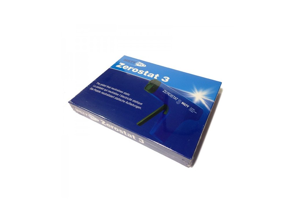 Zerostat 3 od anglické firmy Milty vám pomůže se zbavit jednoduše a rychle statické elektřiny z vašich gramofonových desek. Zerostat se dá použít všude tam, kde je statický náboj nežádoucí. Jak pistole funguje? Namiřte pistoli na ošetřovaný předmět a držte ji ve vzdálenosti přibližně 30 cm. Stiskněte spoušť dostatečně pomalu, abyste neslyšeli cvaknutí přístroje. Tímto pohybem se uvolní silný proud kladně nabitých iontů. Nyní nechte spoušť opět povolit stejně pomalým pohybem. To proveďte opět tak pomalu, abyste neslyšeli cvaknutí pistole. Tímto uvolněním spouště se uvolní proud záporně nabitých iontů. Při správném použití je gramofonová deska zcela zbavena veškerého statického náboje: výsledek je úžasný. V zásadě můžete pistoli použít i k likvidaci jiných předmětů se statickým nábojem. Vždy však dbejte na to, aby tyto předměty nebyly připojeny k elektrické síti nebo baterii. Upozornění: - Uchovávejte mimo dosah dětí. - Nedovolte, aby se ústí dostalo do kontaktu s částmi těla; při napnutí nebo uvolnění spouště dojde k vážnému úrazu elektrickým proudem. - Nepoužívejte v blízkosti (lehce) hořlavých předmětů nebo zařízení, která jsou připojena k elektrické síti nebo baterii. Hmotnost: přibližně 150 gramů. Rozměry: přibližně 160 x 120 x 25 mm. Postup použití: po umytí nebo před přehráváním desky několikrát z každé strany zamiřte cca 20 cm od desky a vypalte dle potřeby obvykle 2x. V případě nutnosti i vícekrát ....Doplňkové parametry