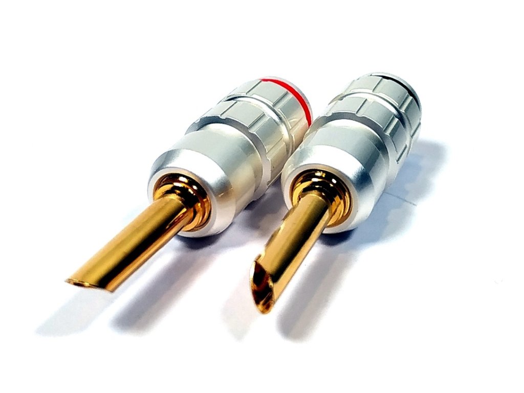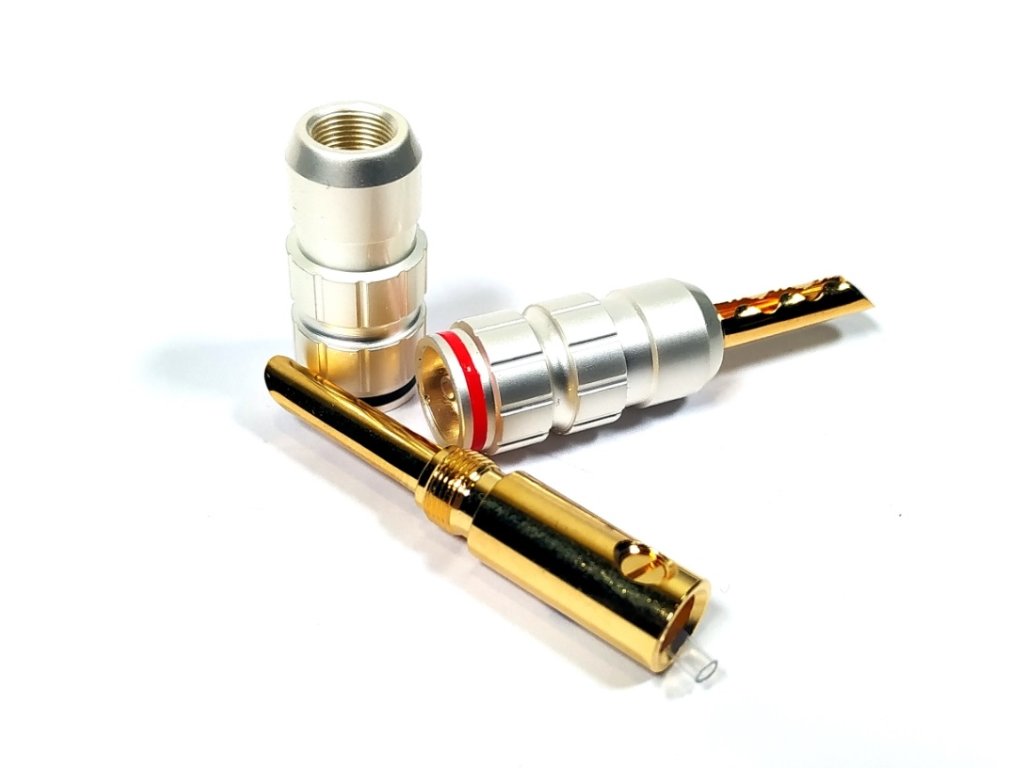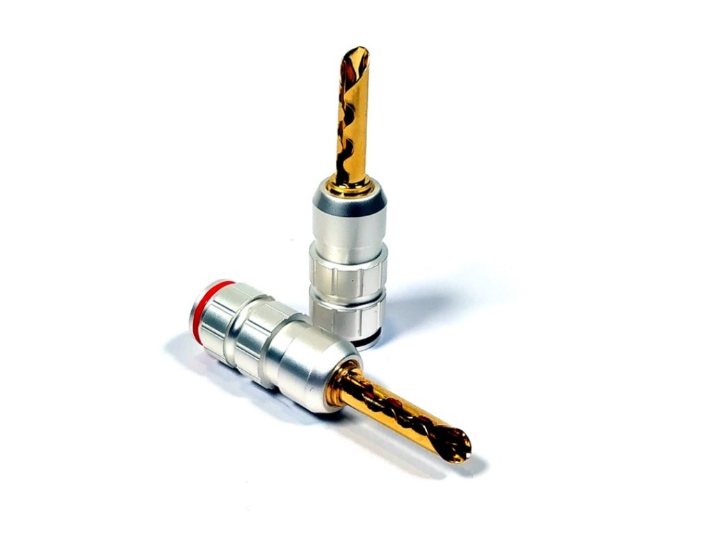 Reproduktorové banánky (konektory)Zlaceno 24K pro maximálně čistý přenos signáluKonektory vyrobené z vysoce čisté mědi - nemagnetickéDutý banánek se silnou předpruženou lamelou zajišťuje díky velké styčné ploše 100% kontakt po dlouho dobuVelmi kvalitní a přesné provedeníUchycení kabelu - 2x šroubek / kovová matná krytka v barevném provedení: bílá perleťVhodné pro kabeláž do průměru 4-5mm (včetně)Cena za jeden pár barevně rozlišených konektorů Barevné provedení: červená a černáDoplňkové parametry