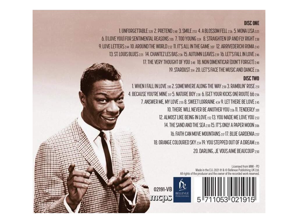 CD1 1. UNFORGETTABLE 3:28 2. PRETEND 2:48 3. SMILE 2:53 4. A BLOSSOM FELL 236 5. MONA LISA 3:25 6. (I LOVE YOU) FOR SENTIMENTAL REASONS 3:05 7. TOO YOUNG 3:24 8. STRAIGHTEN UP AND FLY RIGHT 2:38 9. LOVE LETTERS 2:44 10. AROUND THE WORLD 2:32 11. IT'S ALL IN THE GAME 3:07 12. ARRIVEDERCHI ROMA 2:4313. ST. LOUIS BLUES 2:25 14. CHANTEZ LES BAS 2:36 15. AUTUMN LEAVES 239 16. LET'S FALL IN LOVE 2:4617. THE VERY THOUGHT OF YOU 3:48 18. NON DIMENTICAR (DON'T FORGET) 2:4819. STARDUST 3:14 20. LET'S FACE THE MUSIC AND DANCE 2:26 CD2 1. WHEN I FALL IN LOVE 3:10 2. SOMEWHERE ALONG THE WAY 2:58 3. RAMBLIN' ROSE 2:51 4. BECAUSE YOU'RE MINE 3:17 5. NATURE BOY 2:38 6. (GET YOUR KICKS ON) ROUTE 66 256 7. ANSWER ME, MY LOVE 2:55 8. SWEET LORRAINE 4:34 9. LET THERE BE LOVE 2:4510. THERE WILL NEVER BE ANOTHER YOU 3:36 11. TENDERLY 3:0112. ALMOST LIKE BEING IN LOVE 1:52 13. YOU MADE ME LOVE YOU 2:5314. THE SAND AND THE SEA 230 15. IT'S ONLY A PAPER MOON 3:0616. FAITH CAN MOVE MOUNTAINS 3:17 17. BLUE GARDENIA 2:57 18. ORANGE COLOURED SKY 234 19. YOU STEPPED OUT OF A DREAM 2:35 20. DARLING, JE VOUS AIME BEAUCOUP 2:50Doplňkové parametry