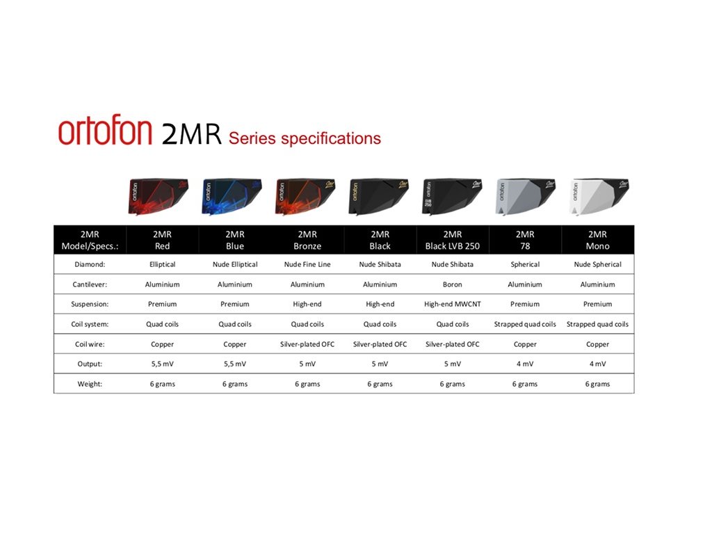 2MR: navrženo pro optimalizovanou montáž na nízkoprofilové gramofony Ortofon 2MR je vybaven speciálně navrženým pouzdrem přenosky přizpůsobeným pro gramofony a raménka, jako je např.: Rega, splňující jejich požadavky na přenosky s nízkým tvarovým faktorem. Díky nízkému tělu přenosky se hladce integruje bez nutnosti úprav nebo distančních vložek pod raménko, což umožňuje rychlou a snadnou montáž pomocí pouhých dvou šroubů. MM přenoska, diamantový eliptický hrot Balení obsahuje: kartáček na hrot, šroubováček a šroubky Made in Denmark. Charakteristika: ➢ preciznější zvuková reprodukce➢ vyjímečná hodnota výkonu k ceně➢ zvuk s vysokým rozlišením vhodný pro moderní nahrávky➢ holý eliptický diamant➢ měděné OFC vodiče ➢ Snížená výška těla o 3mm a celková hmotnost na 6.0 g = CZ ZÁRUKA = Každá přenoska značky Ortofon Hi-Fi z oficiální distribuce v ČR je opatřená přiloženou certifikační kartou s vyplněným typem a výrobním číslem, která tvoří nedílnou součást 2-leté, popř. 3-leté záruky a přelepkou originality zboží. Registrace - ZDE Záruční lhůta: Ortofon Hi-Fi - 2 roky Prodloužená 3-letá záruční lhůta na základě registrace výrobku zakoupeného u autorizovaného prodejce značky Ortofon. Podmínkou uplatnění záruky je instalace a nastavení výrobku, kterou provedla odborně způsobilá organizace či osoba. Co charakterizuje barevné rozlišení ?? RED (červené) - univerzální přenosky, které dodávají otevřený, dynamický zvuk s mírným dotekem teplaBLUE (modré) - přidávají více dynamiky a rozlišení, mají otevřenější zvuk a reprodukují více detailůBRONZE (bronzová) - přidávají ještě více detailů a rozlišení, ale velmi rovnoměrným způsobem, který respektuje všechny složkyBLACK (černá) - nejlepší ze všech! Opravdu zajede do drážky s rozlišením a přesným náhledem každé nahrávky Výstupní napětí při 1000 Hz, 5cm/sec. 5,5 mV Rovnováha kanálů při 1 kHz 1,5 dB Separace kanálů při 1 kHz 25 dB Separace kanálů při 15 kHz 15 dB Frekvenční rozsah při - 3 dB 20-25.000 Hz Frekvenční odezva 20-20.000 + 2 / - 1 dB Sledovací schopnost na 315Hz 80 um Poddajnost 20 um / mN Hrot Diamond - Eliptický hrot Radius špičky hrotu r / R 8 / 18 ?m Rozsah přítlačné síly 1,6-2,0 g (16-20 mN) Doporučený přítlak 1,8 g (18 mN) Sledovací úhel 20 ° Vnitřní impedance, DC odpor 1,3 kOhm Vnitřní indukčnost 700 mH Doporučený zatěžovací odpor 47 kOhm Doporučená zatěžovací kapacita 150-300 pF Hmotnost přenosky 6,0 gDoplňkové parametry