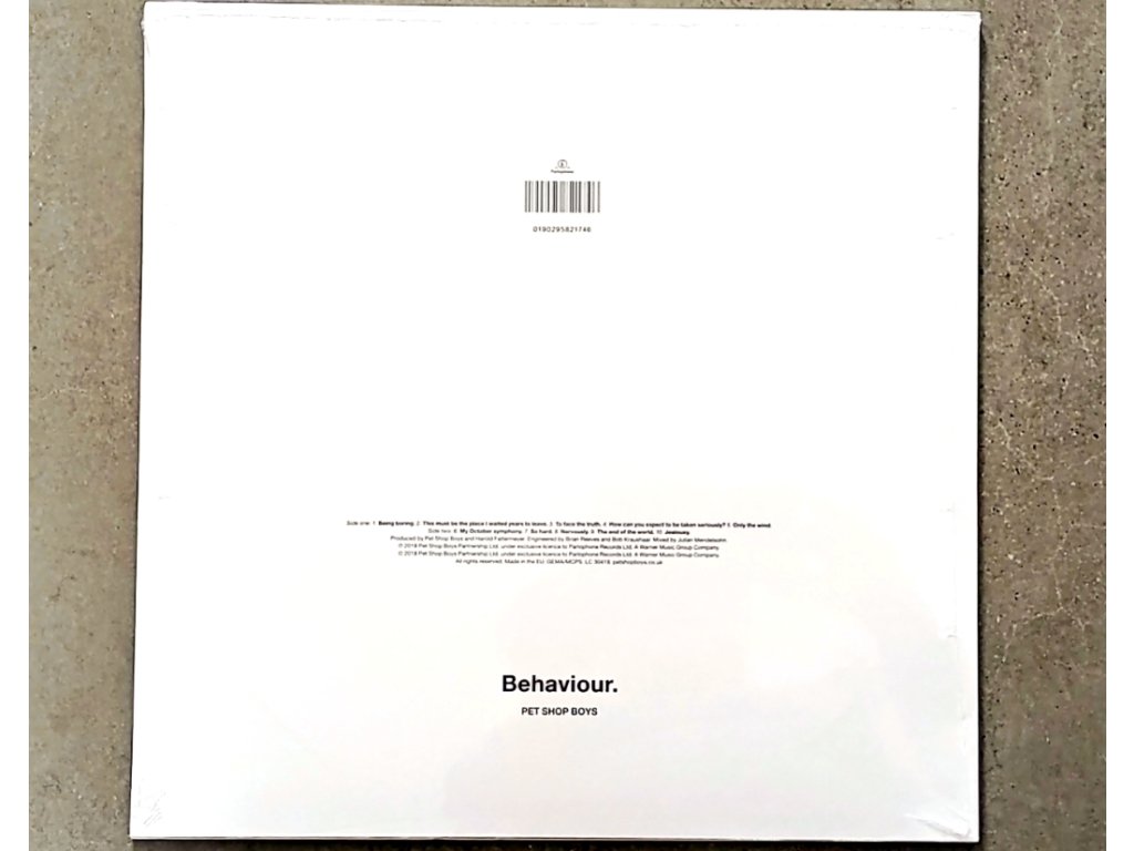 LP Pet Shop Boys: Behaviour. 180g 2018 Remastered Vinyl / Parlophone 31. srpna 2018 Evropa Pet Shop Boys: Behaviour. verze na vinylu LP v remasterované edici. Toto konkrétní vydání vyšlo v Evropě ve vydavatelství Parlophone dne 31. srpna 2018. A1 Being Boring 6:48 min Guitar J.J. Belle | Performer [Plastic Tube] Dominic Clarke A2 This Must Be The Place I Waited Years To Leave 5:30 min Arranged By [Orchestra], Conductor Angelo Badalamenti | Rhythm Guitar, Guitar [Feedback] Johnny Marr A3 To Face The Truth 5:33 min A4 How Can You Expect To Be Taken Seriously? 3:55 min A5 Only The Wind 4:19 min Arranged By [Orchestra], Conductor Angelo Badalamenti B6 My October Symphony 5:17 min Arranged By [String Quartet] Alexander Balanescu | Guitar Johnny Marr | Strings The Balanescu Quartet | Vocals [Additional] Jay Henry B7 So Hard 3:59 min B8 Nervously 4:07 min B9 The End Of The World 4:41 min B10 Jealousy 4:47 minDoplňkové parametry