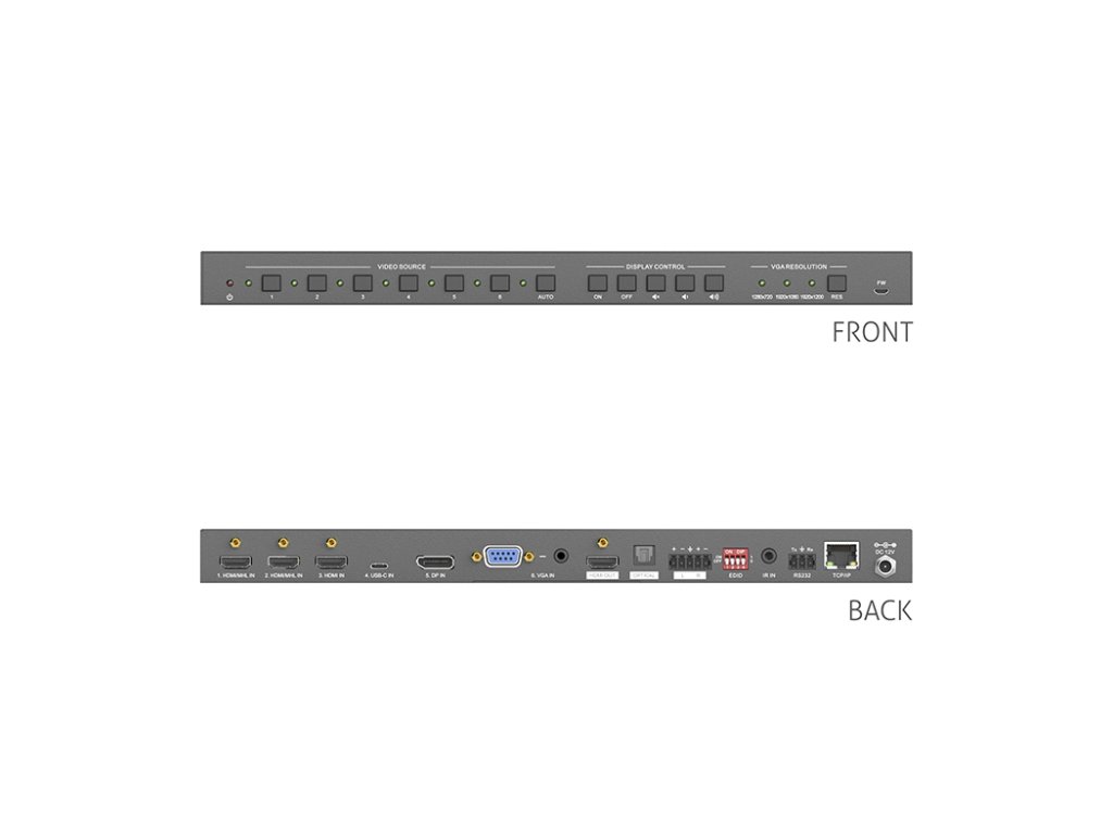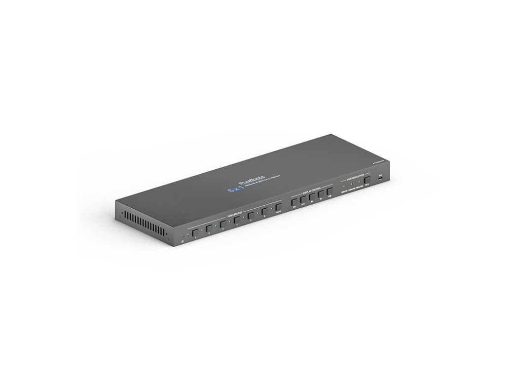 PT-PSW-61E 6x1 4K 18Gb/s multipřepínač se scalerem Vlastnosti: Přepíná 3 HDMI a USB-C / DisplayPort / VGA signály do 1 HDMI výstupu Podporuje 18Gb/s pro rozlišení až 4K UltraHD 60Hz HDMI 5V (HPD) nebo aktivní video stream (TMDS přepínání) Upscaling a downscaling až WUXGA pro VGA, analogový / digitální audio de-embedding EDID management, přepínatelný EDID, ovládácí funkceDoplňkové parametry