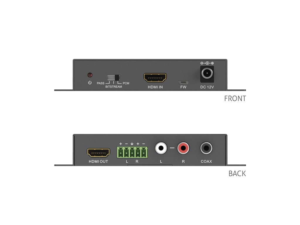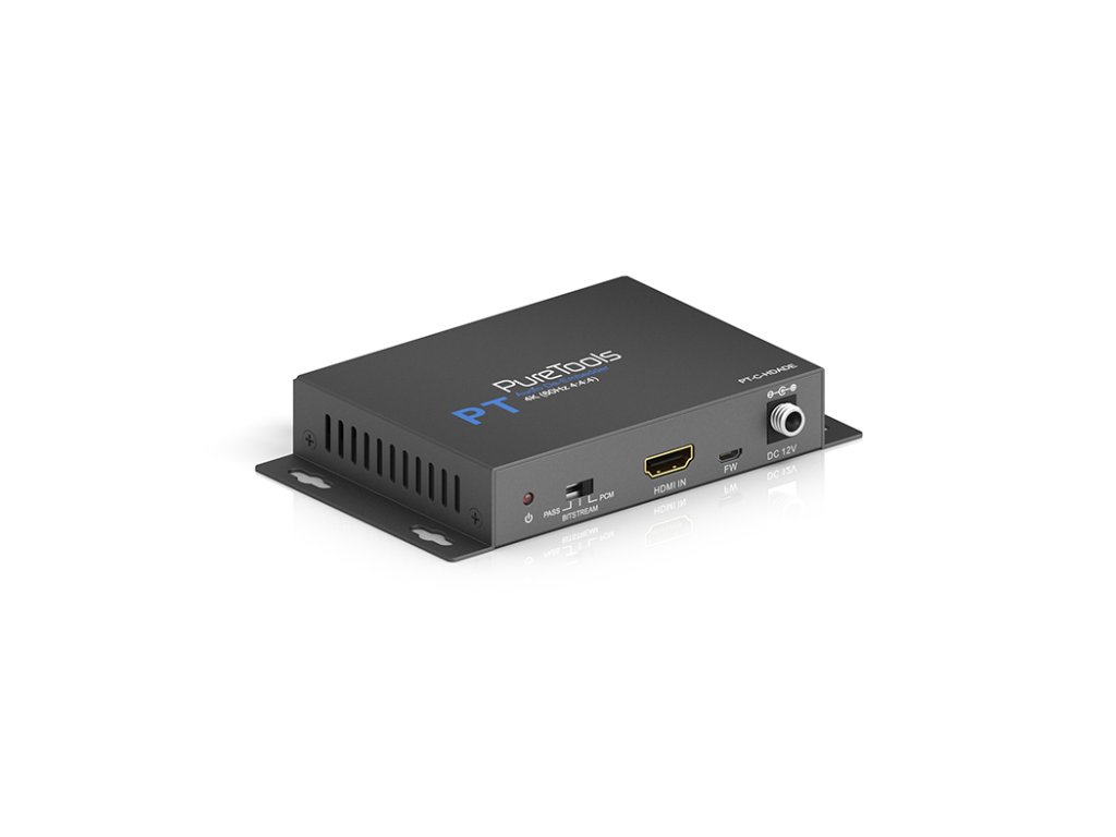 PureLink PT-C-HDADE HDMI audio de-embedder 4K (60Hz 4:4:4) s HDR PT-C-HDADE je HDMI 2.0a audio extraktor s řadou portů pro extrakci zvuku podporující plnou šířku pásma HDMI, takže se ideálně hodí pro domácí kino a špičkové profesionální instalace. Video přenos v rychlosti 18 Gb/s a zvuk je extrahován ze streamu v digitálním i analogovém formátu. Zařízení má schopnost maskovat EDID displeje, takže pokud například televizor nepodporuje zvuk Dolby Digital, lze DTS stále extrahovat a předat přímo do AVR. Tato inteligentní funkce zajišťuje kompatibilitu s jakýmkoli 4K televizorem nebo monitorem. Vlastnosti: Audio de-embeding z 1 HDMI signálu na 1 HDMI a 2 D/A audio výstupy Podporuje 18Gb/s pro rozlišení až 4K UltraHD 60Hz 3 audio režimy: průchod, bitstream a PCM, formáty až do DTS-HD / TrueHD Podpora CEC, správa EDID pro zvýšenou kompatibilitu AVR Pro výstup zvuku není potřeba připojení obrazovkyDoplňkové parametry