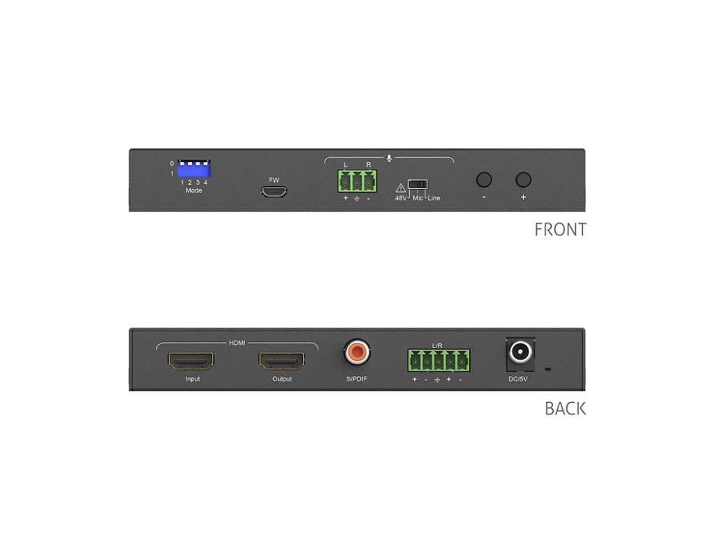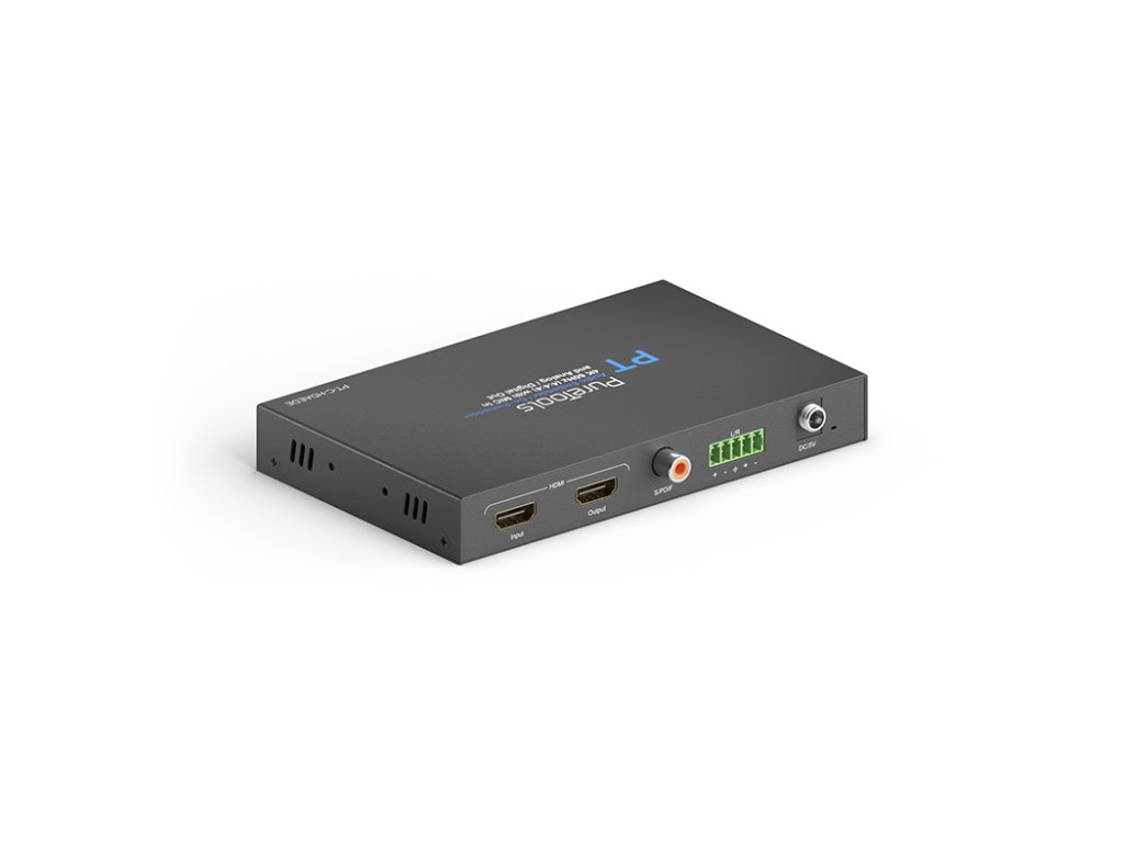 PureLink PureTools PT-C-HDAEDE 4K 18Gb/s HDMI Audio De-Embedder a Embedder PT-C-HDAEDE je HDMI 2.0 audio De-Embedder a Embedder, který umožňuje velké množství komplexních audio manipulací, a proto je vhodný jak pro domácí kina tak i profesionální high-end instalace. Podporuje plnou HDMI 2.0 18Gb/s šířku pásma na HDMI vstupu / výstupu a přenáší HDMI audio signál v digitálním i analogovém formátu. Zároveň může být analogový audio signál (Line / Mic / Mic s 48V napájením) embedován a mixován s HDMI audiem nebo je plně nahrazen. ARC signály jsou také přenášeny v opačném směru přes HDMI. Integrovaný downscaler převádí 4K rozlišení na FullHD / 1080p. Vlastnosti: Audio de-embedding a embedding s HDMI a D/A vstupy / výstupy Podporuje 18Gb/s pro rozlišení až 4K UltraHD 60Hz Komplexní audio manipulace včetně MIC/LINE mixování a integrace HDMI 48V phantom napájení, digitální / analogový audio de-embedding Downscaling (4K - 1080p), ARC, formáty až do DTS-X / AtmosDoplňkové parametry
