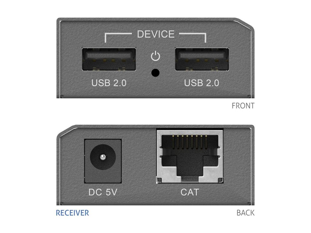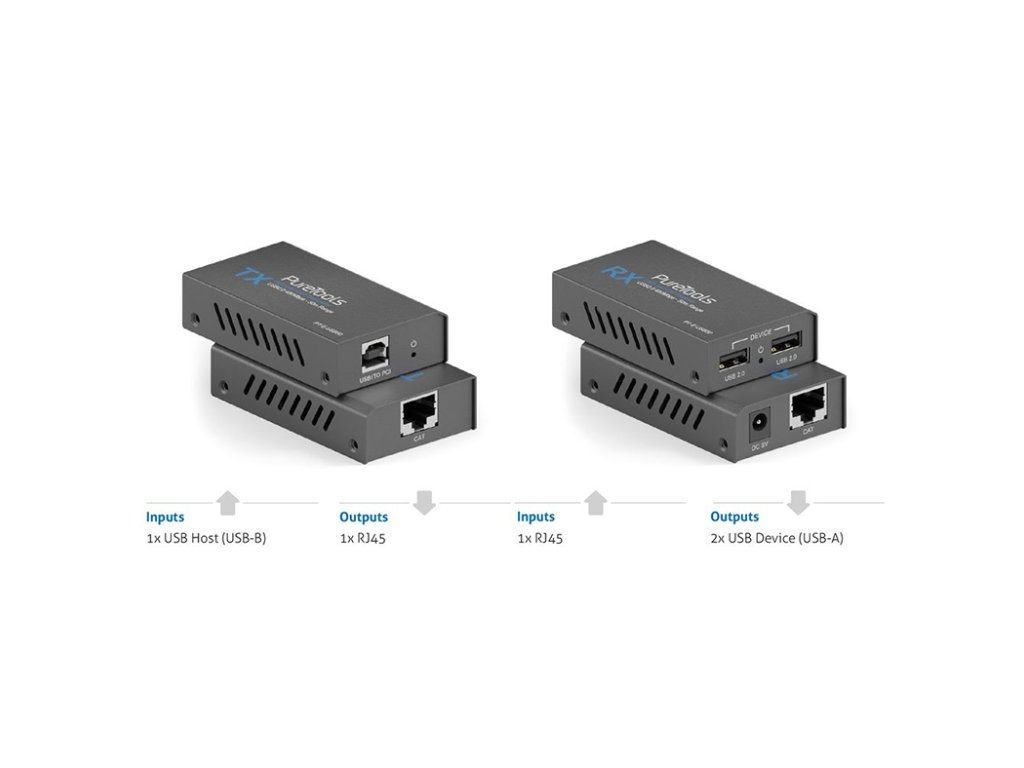 PureLink PT-E-USB50 USB 2.0 CAT extender USB 2.0 prodloužení protokolu až do 480Mb/s Přenos až do 50 metrů s CAT 5e/6 kabelem USB-B vstup na TX, 2x USB-A 2.0 porty na RX Jednosměrné napájení ze strany přijímače Schopnost dlouhého dosahu: Tada extenderu umožňuje prodloužit připojení USB až na 50 m pomocí kabelů CAT 5e/6.Praktické porty: Vysílač je vybaven vstupem USB-B, zatímco přijímač má 2 porty USB-A 2.0, které umožňují připojení více zařízení.Jednosměrné napájení: Poskytuje jednosměrné napájení ze strany přijímače a zajišťuje efektivní dodávku energie do vašich připojených zařízení.Kompaktní a profesionální: Extender PureTools ProAV USB 2.0, navržený s kompaktním profesionálním krytem, je stylový i funkční a bez problémů zapadne do jakéhokoli nastavení.Doplňkové parametry