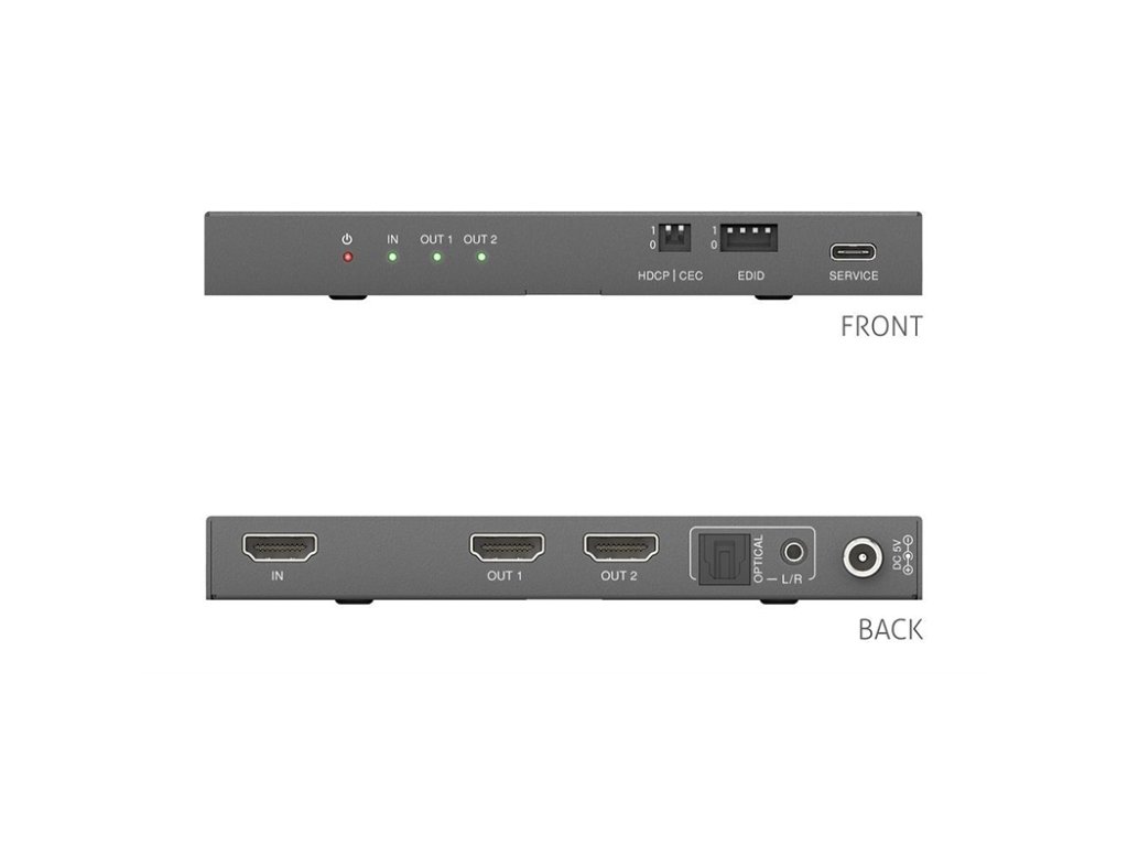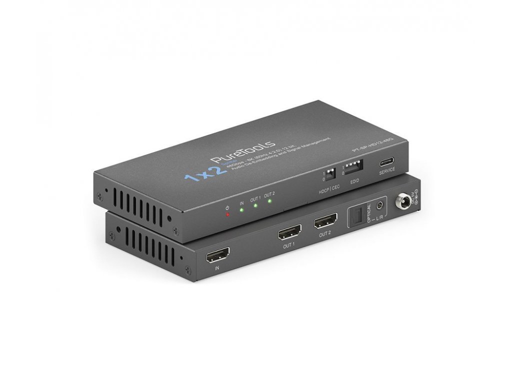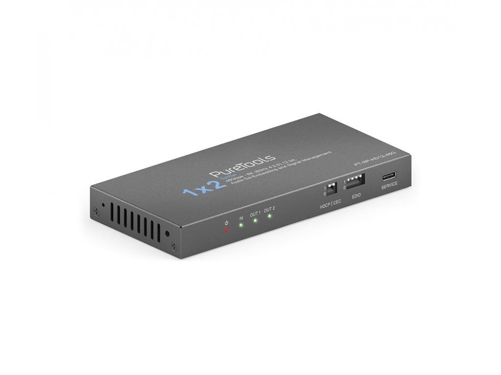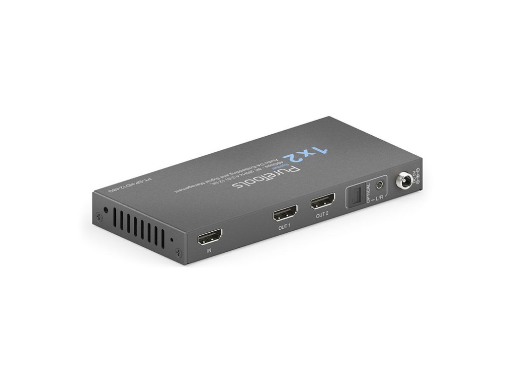PureLink PT-SP-HD12-48G 1x2 HDMI 2.1 rozbočovač 8K60 / 4K120 - 48Gb/s se scalerem a audio de-embedingem Řada rozbočovačů PureTools HDMI 2.1 48Gb/s – 1x2, 1x4 a 1x8 Ultra HD připojení díky ohromující šířce pásma 48 Gb/s FRL (Fixed Rate Link) zaručuje rozbočovač PureTools HDMI 2.1 bezchybnou distribuci vašeho obsahu s ultra vysokým rozlišením. Vychutnejte si pohlcující obraz při super rychlé snímkové frekvenci díky působivé řadě standardů zobrazení. Ať už jde o rozlišení 8K při 60 Hz v 4:2:0 12bit, 8K rozlišení při 30 Hz v 4:4:4 12bit nebo rozlišení 4K při 120 Hz v 4:4:4 12bit, máme pro vás vše. Užijte si dynamický rozsah HDR10+, filmový zážitek Dolby Vision a pohlcující zvuk DTS-HD. Díky podpoře YCbCr 4:4:4 a 4:2:2 a také YUV 4:2:0 náš rozbočovač zajišťuje synchronizaci zvuku a videa jako nikdy předtím. Výjimečná čistota 8K, živé 12bitové barvy a plynulý 120Hz pohyb. Kompatibilita bez kompromisů - rozbočovač je navržen tak, aby se hladce integroval do vašeho stávajícího nastavení. Díky komplexním možnostem správy EDID a HDCP 1.4 / 2.3 se můžete rozloučit s problémy s kompatibilitou. Náš inovativní přepínač CEC On/Off vám umožní snadno ovládat vaše HDMI zařízení. Vlastnosti 48Gb/s FRL - 8K 60Hz 4:2:0 12bit / 4K 120Hz 4:4:4 12bit, s plnou podporou VRR, ALLM, QMS, QFT, SBTM 12bitová barevná hloubka s podporou HDR10+, Dolby Vision, RGB, YCbCr 4:4:4 / 4:2:2. YUV 4:2:0 Digitální SPDIF a analogový 3,5 mm audio deembedding Komplexní možnosti správy EDID a HDCP 1.4 / 2.3 Přepínač CEC On/Off, downscaling z 8K na 4K a 8K/4K na 1080pDoplňkové parametry