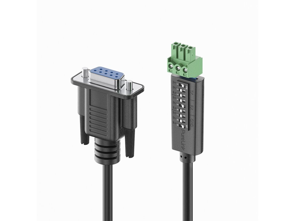 PureLink PureTools PTM-RS100 konfigurovatelný RS232 kabel s DIP přepínačem PTM-RS100 RS232 řídící kabel od PureTools s 9-pinovým konektorem s D-typem a 3-pinovým Phoenix konektorem na druhé straně. Pomocí 3x3 DIP přepínačů lze libovolně konfigurovat přiřazení Tx, Rx a GND na výstup Phoenix. Umožňuje, aby se RS232 řídící signály přizpůsobily podle specifických požadavků zařízení a výrobce bez nutnosti výměny kabelu. Vlastnosti: 1.5m řídící kabel pro správu RS232 zařízení 9-pinový D-typ na 3-pinový Phoenix Variabilní DIP přepínač TX, RX a GND na Phoenix portu Pro specifickou konfiguraci RS232 signálu Kompatibilní s PureTools, mediahub a dalšími značkamiDoplňkové parametry