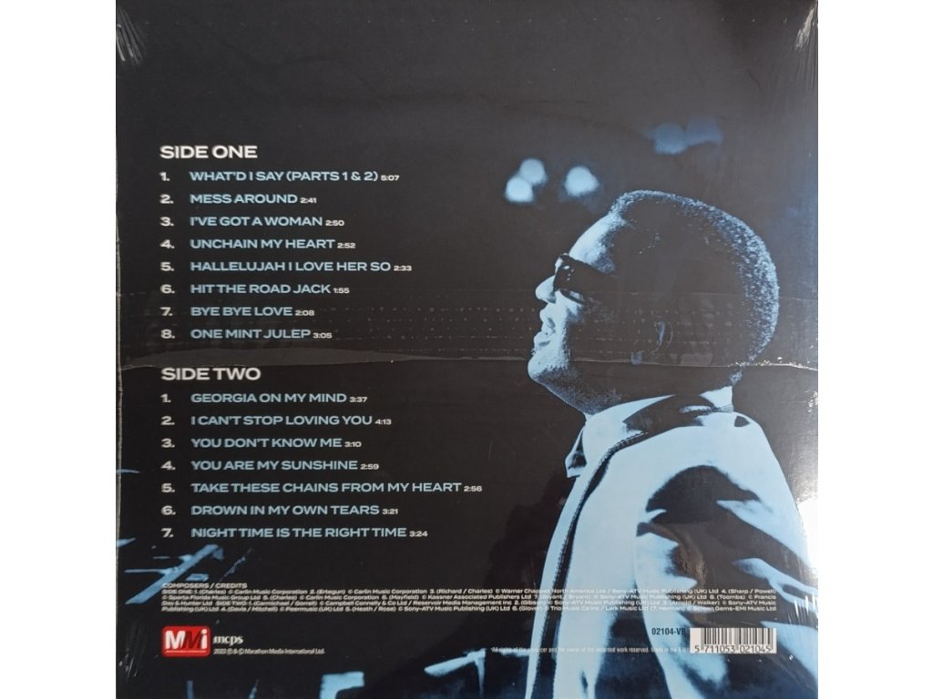 Referenční LP v limitované edici / 180g - 2022 Bellevue Entertainment 180g, Reference master vinyl, Limited edition, 100 % analogové album s referenční zvukovou kvalitou- Analog Experience Exkluzivní obal a příslušenství podtrhuje výjimečnost těchto nahrávek od Bellevue Entertainment SIDE ONE: 1 WHAT'DI SAY (PARTS 1 & 2) 5:072 MESS AROUND 2:413 I WE GOT A WOMAN 2:504 UNCHAIN MY HEART 2:525 HALLELUJAH I LOVE HER SO 2:336 HIT THE ROAD JACK 1:557 BYE BYE LOVE 2:088 ONE MINT JULEP 3:05 SIDE TWO: 1 GEORGIA ON MY MIND 3:372 I CAN'T STOP LOVING YOU 4:133 YOU DON'T KNOW ME 3:104 YOU ARE MY SUNSHINE 2:595 TAKE THESE CHAINS FROM MY HEART 2:566 DROWN IN MY OWN TEARS 3:217 NIGHT TIME IS THE RIGHT TIME 3:24Doplňkové parametry