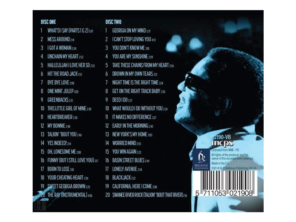 DISC ONE1 WHAT'DI SAY (PARTS 1 & 2) 5:072 MESS AROUND 2:413 I GOT A WOMAN 2:504 UNCHAIN MY HEART 2:525 HALLELUJAH I LOVE HER SO 2:336 HIT THE ROAD JACK 1:557 BYE BYE LOVE 2:088 ONE MINT JULEP 3:059 GREENBACKS 2:5110 THIS LITTLE GIRL OF MINE 2:3011 HEARTBREAKER 2:5012 MY BONNIE 2:4813 TALKIN' 'BOUT YOU 2:4614 YES INDEED! 21415 OH, LONESOME ME 2:0816 FUNNY (BUT I STILL LOVE YOU) 3:17 1617 BORN TO LOSE 3:1018 YOUR CHEATING HEART 3:3419 SWEET GEORGIA BROWN 22520 THE RAY (INSTRUMENTAL) 4:06 DISC TWO 1 GEORGIA ON MY MIND 3:372 I CAN'T STOP LOVING YOU 4:133 YOU DON'T KNOW ME 3:104 YOU ARE MY SUNSHINE 2:595 TAKE THESE CHAINS FROM MY HEART 2:566 DROWN IN MY OWN TEARS 3:217 NIGHT TIME IS THE RIGHT TIME 3248 GET ON THE RIGHT TRACK BABY 2:209 DEEDIDO 2:2710 WHAT WOULD I DO WITHOUT YOU 23411 IT MAKES NO DIFFERENCE 3:2712 EARLY IN THE MORNING 2:4513 NEW YORK'S MY HOME 3:0314 WORRIED MIND 2:5515 YOU WIN AGAIN 3:2316 FUNNY (BUT I STILL LOVE YOU) 3:17 1617 BORN TO LOSE 3:1018 YOUR CHEATING HEART 3:3419 SWEET GEORGIA BROWN 22520 THE RAY (INSTRUMENTAL) 4:0619 CALIFORNIA, HERE I COME 2:0820 SWANEE RIVER ROCK (TALKIN' 'BOUT THAT RIVER) 2:16Doplňkové parametry