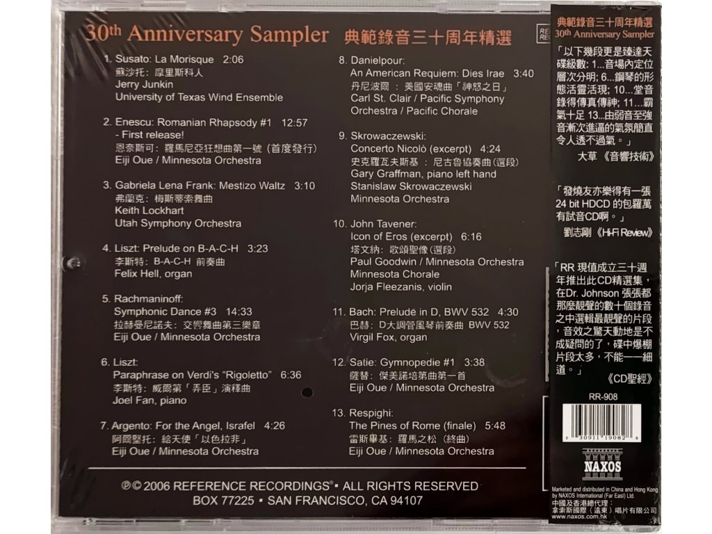 HDCD / 24bitMusicians:Minnesota Orchestra (2,5,7,9,10,12,13)Eiji Oue, conductor (2,5,7,12,13)Paul Goodwin, conductor (10)Stanislav Skrowaczewksi, conductor (9)Utah Symphony (3)Keith Lockhart, conductor (3)Felix Hell, organ (4)Virgil Fox, organ (11)Gary Graffman, piano (9)Joel Fan, piano (6)Pacific Symphony Orchestra & Chorus (8)Carl St. Clair, conductor (8)University of Texas Wind Ensemble (1)Jerry Junkin (1)Jorja Fleezanis, violin (10)Selections:SusatoLa Morisque from the DansyereEnescuRumanian Rhapsody No. 1 (First release)Gabriela Lena FrankMestizo WaltzFranz Liszt (1811-1886)Prelude on B-A-C-HSergey Rachmaninov (1873-1943)Symphonic Dance No. 3Franz ListParaphrase on Verdi's RigolettoArgentoFor the Angel IsrafelDanielpourAn American Requiem: Dies IraeSkrowaczewskiConcerto Nicolo (excerpt)John Tavener (1944- )Ikon or Eros (excerpt)Johann Sebastian Bach (1685-1750)Prelude in DErik Satie (1866-1925)Gymnopedie No. 1Ottorino Respighi (1879-1936)The Pines of Rome (finale)Doplňkové parametry