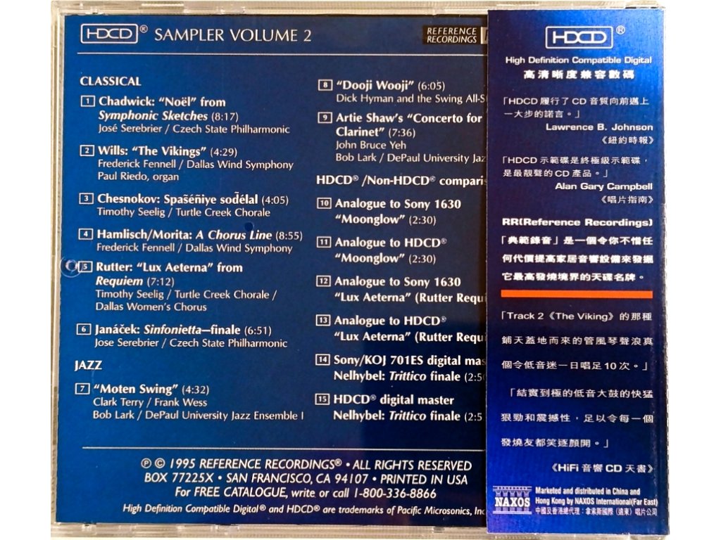 HDCD / 24bit Katalogové číslo: RR-905Skladatelé: Arthur Wills , Artie Shaw , George Chadwick , John Rutter , Leoš Janáček , Marvin Hamlisch , Pavel ChesnokovRok vydání: 1995-05-07Dostupné formáty: HDCDUPC/EAN: 30911190521 DCD Sampler Volume 2 Classical1. Chadwick: „Noël“ from Symphonic SketchesJosé Serebrier / Czech State Philharmonic 2. Wills: „The Vikings“Frederick Fennell / Dallas Wind Symphony, Paul Riedo, organ 3. Chesnokov: Spaséñiye sodélalTimothy Seelig / Turtle Creek Chorale 4. Hamlisch/Morita: A Chorus LineFrederick Fennell / Dallas Wind Symphony 5. Rutter: „Lux Aeterna“ from RequiemTimothy Seelig / Turtle Creek Chorale / Dallas Women’s Chorus 6. Janácek: Sinfonietta – finaleJosé Serebrier / Czech State Philharmonic Jazz7. Moten SwingClark Terry / Frank Wess/ Bob Lark / DePaul Universtiy Jazz Ensemble I 8. Dooji WoojiDick Hyman and the Swing All-Stars 9. Artie Shaw’s „Concerto for Clarinet“John Bruce Yeh / Bob Lark / DePaul Universtiy Jazz Ensemble I HDCD® / Non-HDCD® comparisons10. Analogue to Sony 1630„Moonglow“ 11. Analogue to HDCD®„Moonglow“ 12. Analogue to Sony 1630„Lux Aeterna“ (Rutter Requiem) 13. Analogue to HDCD®„Lux Aeterna“ (Rutter Requiem) 14. Sony/KOJ 701ES digital masterNelhybel: Trittico finale 15. HDCD® digital masterNelhybel: Trittico finaleDoplňkové parametry