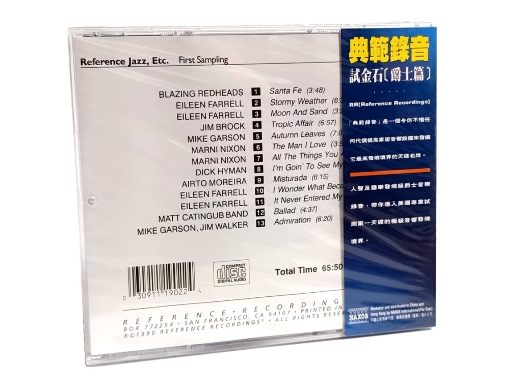 HDCD / 24bit Catalog No: RR-S2Artists: Airto Moreira, Blazing Redheads, Dick Hyman, Eileen Farrell, Jim Brock, Jim Walker, Marni Nixon, Mike GarsonRelease Year: 1990-05-31Available Formats: HDCDUPC/EAN: 30911190224 1 Blazing Redheads– Santa Fe Bass – Susan Colson Congas, Percussion – Jodu Graboyes Drum, Percussion – Danielle Dowers Flute – Donna Viscuso Keyboards – Deborah Hungerford Saxophone – Klaudia Promessi Timbales, Percussion – Michaelle Goerlitz Bass – Susan Colson Congas, Percussion – Jodu Graboyes Drum, Percussion – Danielle Dowers Flute – Donna Viscuso Keyboards – Deborah Hungerford Saxophone – Klaudia Promessi Timbales, Percussion – Michaelle Goerlitz 3:48 2 Eileen Farrell– Stormy Weather Bass – Terry Peoples Drums – Bill Stowe Guitar – Greg Hyslop Piano – Loonis McGlohon Saxophone – Phil Thompson (5) Trumpet – Joe Wilder Vocals – Eileen Farrell Bass – Terry Peoples Drums – Bill Stowe Guitar – Greg Hyslop Piano – Loonis McGlohon Saxophone – Phil Thompson (5) Trumpet – Joe Wilder Vocals – Eileen Farrell 6:38 3 Eileen Farrell– Moon And Sand Bass – Terry Peoples Drums – Bill Stowe Flute – Phil Thompson (5) Guitar – Greg Hyslop Piano – Loonis McGlohon Vocals – Eileen Farrell Bass – Terry Peoples Drums – Bill Stowe Flute – Phil Thompson (5) Guitar – Greg Hyslop Piano – Loonis McGlohon Vocals – Eileen Farrell 3:22 4 Jim Brock– Tropic Affair Bass – Glenn Kawamoto Drums – Donnie Marshall Guitar – John Sharp (8) Percussion – Jim Brock Piano – Ted Howe Saxophone – Tim Gordon Synthesizer – Bill Gerhardt Trumpet – Jon Thornton Bass – Glenn Kawamoto Drums – Donnie Marshall Guitar – John Sharp (8) Percussion – Jim Brock Piano – Ted Howe Saxophone – Tim Gordon Synthesizer – Bill Gerhardt Trumpet – Jon Thornton 6:57 5 Mike Garson– Autumn Leaves Bass – Stanley Clarke Drums – Billy Mintz Piano – Mike Garson Bass – Stanley Clarke Drums – Billy Mintz Piano – Mike Garson 7:05 6 Marni Nixon– The Man I Love Piano – Lincoln Mayorga Vocals – Marni Nixon Piano – Lincoln Mayorga Vocals – Marni Nixon 3:58 7 Marni Nixon– All The Things You Are Piano, Arranged By – Lincoln Mayorga Vocals – Marni Nixon Piano, Arranged By – Lincoln Mayorga Vocals – Marni Nixon 3:42 8 Dick Hyman– I'm Goin' To See My Ma Piano – Dick Hyman Piano – Dick Hyman 3:12 9 Airto Moreira– Misturada Bass – Mark Egan Drums – Airto Moreira Flute – Joe Farrell Piano – Kei Akagi Bass – Mark Egan Drums – Airto Moreira Flute – Joe Farrell Piano – Kei Akagi 6:15 10 Eileen Farrell– I Wonder What Became Of Me Drums – Bill Stowe Guitar – Greg Hyslop Piano – Loonis McGlohon Saxophone – Doug Henry (2) Vocals – Eileen Farrell Drums – Bill Stowe Guitar – Greg Hyslop Piano – Loonis McGlohon Saxophone – Doug Henry (2) Vocals – Eileen Farrell 3:45 11 Eileen Farrell– It Never Entered My Mind Bass – Terry Peoples Drums – Bill Stowe Flugelhorn – Joe Wilder Guitar – Greg Hyslop Piano – Loonis McGlohon Vocals – Eileen Farrell Bass – Terry Peoples Drums – Bill Stowe Flugelhorn – Joe Wilder Guitar – Greg Hyslop Piano – Loonis McGlohon Vocals – Eileen Farrell 5:28 12 Matt Catingub Band– Ballad Band – Matt Catingub Band Saxophone – Matt Catingub Band – Matt Catingub Band Saxophone – Matt Catingub 4:37 13 Mike Garson, Jim Walker (3)– Admiration Flute – Jim Walker (3) Piano – Mike Garson Flute – Jim Walker (3) Piano – Mike Garson 6:20 https://referencerecordings.com/recording/reference-jazz-sampler/Doplňkové parametry