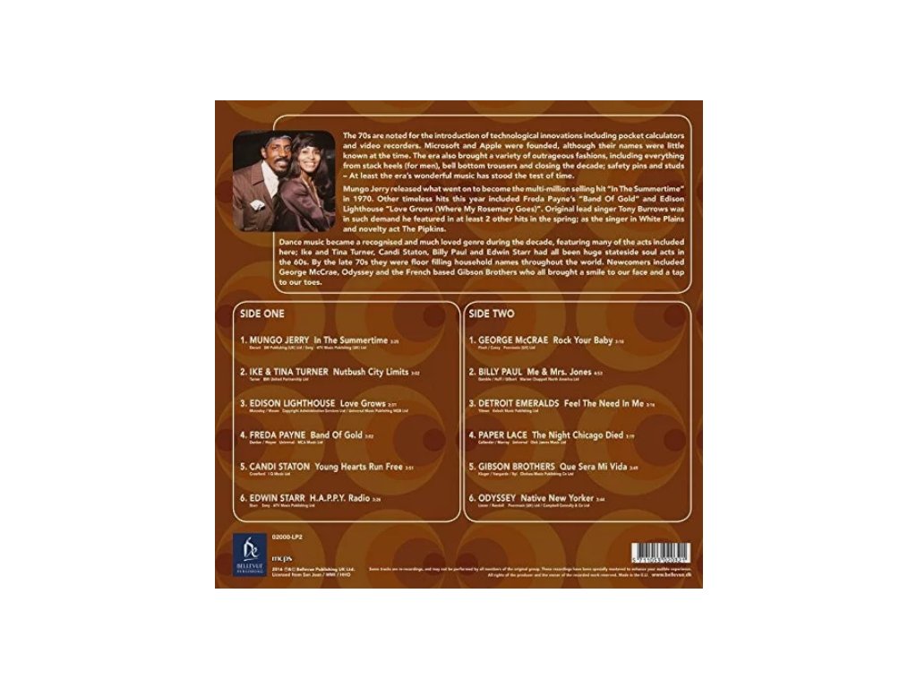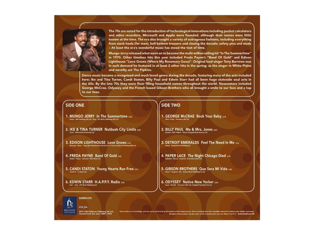Sensational 70's Bellevue Publishing UK Ltd 140g, Reference master vinyl, Limited edition, 100 % analogové album s referenční zvukovou kvalitou- Analog Experience Exkluzivní obal a příslušenství podtrhuje výjimečnost těchto nahrávek od MARATHON MEDIA INTERNATIONAL / Economic label A1 Mungo Jerry: In The Summertime 3:25 min A2 Ike & Tina Turner: Nutbush City Limits 3:02 min A3 Edison Lighthouse: Love Grows 2:31 min A4 Freda Payne: Band Of Gold 3:02 min A5 Candi Staton: Young Hearts Run Free 3:51 min A6 Edwin Starr: H.A.P.P.Y. Radio 3:26 min B1 George McCrae: Rock Your Baby 3:18 min B2 Billy Paul: Me & Mrs. Jones 4:53 min B3 Detroit Emeralds: Feel The Need In Me 3:16 min B4 Paper Lace: The Night Chicago Died 3:19 min B5 Gibson Brothers: Que Sera Mi Vida 3:49 min B6 Odyssey: Native New Yorker 3:44 minDoplňkové parametry