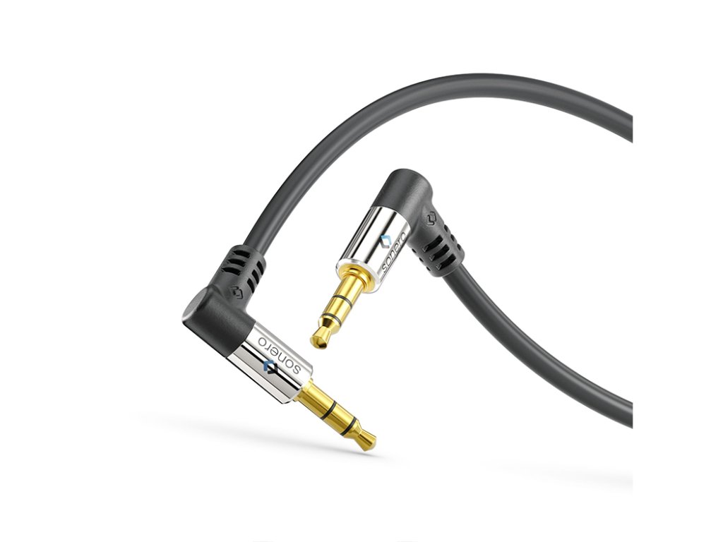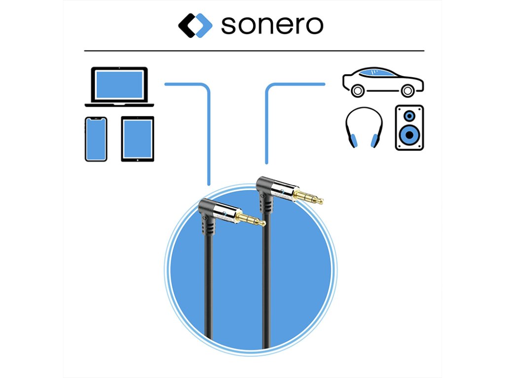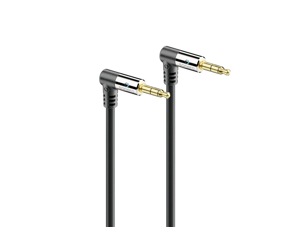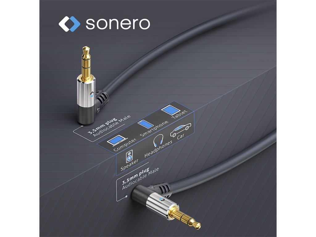 Sonero S-AC520 audiokabel s 3,5m jackem a zahnutým konektorem Sonero S-AC520 je kvalitní audiokabel určený pro přenos analogových stereo zvukových signálů prostřednictvím 3,5mm jacku. Je vybaven pozlacenými kontakty, chromovanými hliníkovými konektory a ochranným prvkem proti ohybu. Kabel disponuje 90° 3,5mm samcem na obou stranách. Měděné vodiče jsou dvojitě chráněné a mají navíc PVC obal s vnějším průměrem 4 mm. Audiokabel od společnosti Sonero umožňuje optimální a trvanlivou kvalitu přenosu s dlouhodobou ochranou proti korozi a je vhodný pro připojení zařízení s 3,5mm jackem k odpovídajícímu zesilovači a dalším zařízením. Dostupné délky: 0,5 m, 1 m, 1,5 m, 2 m, 3 m, 5 m Sonero – Výrobky vysoké kvality pro spotřebitelský trh Audiokabelová řada Sonero S-AC500 až S-AC900 v kombinaci s adaptéry S-ACA012 / 013 slouží pro přenos analogových zvukových signálů s 3,5mm jackovými konektory a analogových nebo digitálních signálů s RCA konektory. Kabely a adaptéry umožňují přenos stereo zvuku nebo digitálního koaxiálního zvuku S/PDIF. Všechny kabely (včetně 25cm portsaver kabelů) mají měděné vodiče, dvojitou ochrannou vrstvu a vnější obal z kvalitního PVC o různých průměrech. Konektory všech kabelů a adaptérů jsou vyrobeny z chromovaného hliníku, jsou vybaveny pozlacenými kontakty a ochranným prvkem proti ohybu, který zmenšuje zatížení konektorů a zabraňuje opotřebení. Zároveň zabrání neúmyslnému překročení minimálního poloměru ohybu u konektoru. Přenos signálu je vždy bezchybný a kabel i konektory jsou účinně chráněny proti korozi. Všechny kabely a adaptéry lze používat obousměrně. Audiokabely Sonero jsou optimálně chráněny proti rušivým signálům, včetně těch pocházejících z mobilních telefonů a rádiových frekvencí. Audiokabely jsou vhodné pro všechny analogové nebo digitální zvukové signály, mohou být využity jako propojení mezi přehrávacími zařízeními (televizory, chytré telefony, BluRay přehrávače, streamery atd.) a dalšími přehrávacími zařízeními jako je např. zesilovač zvuku.Doplňkové parametry