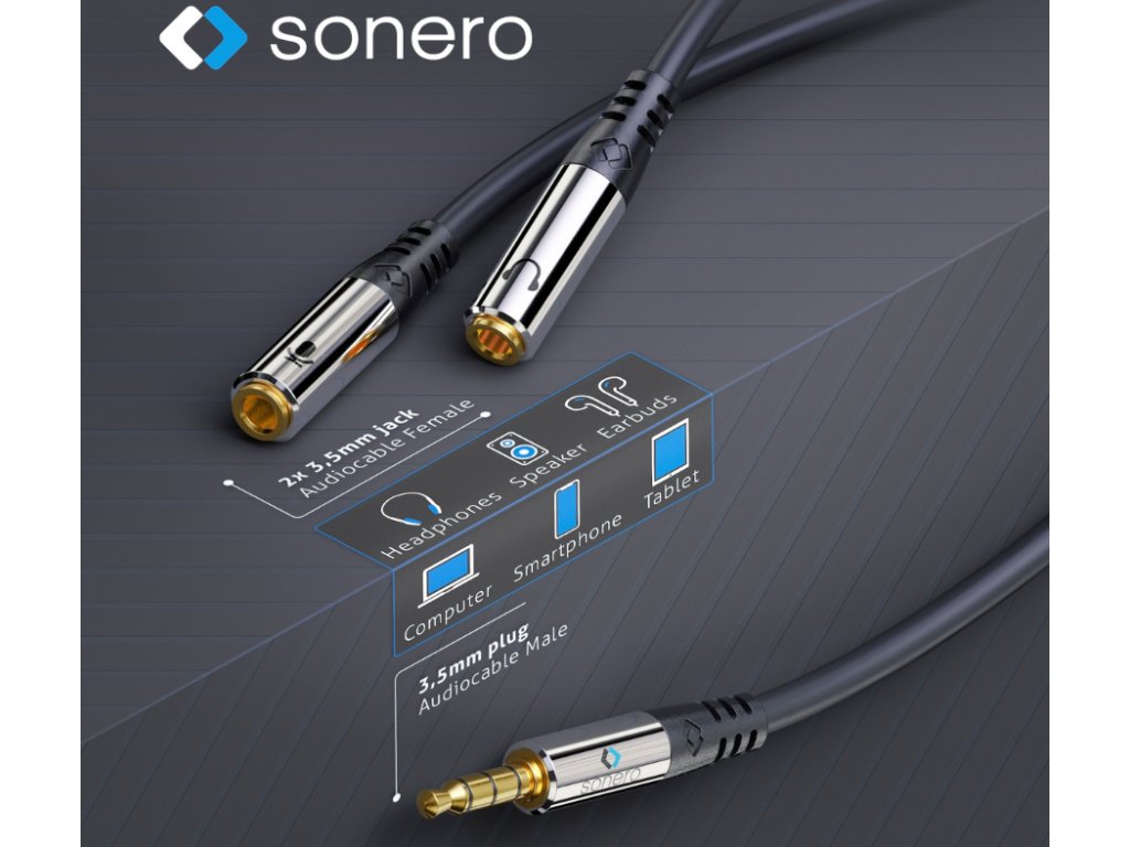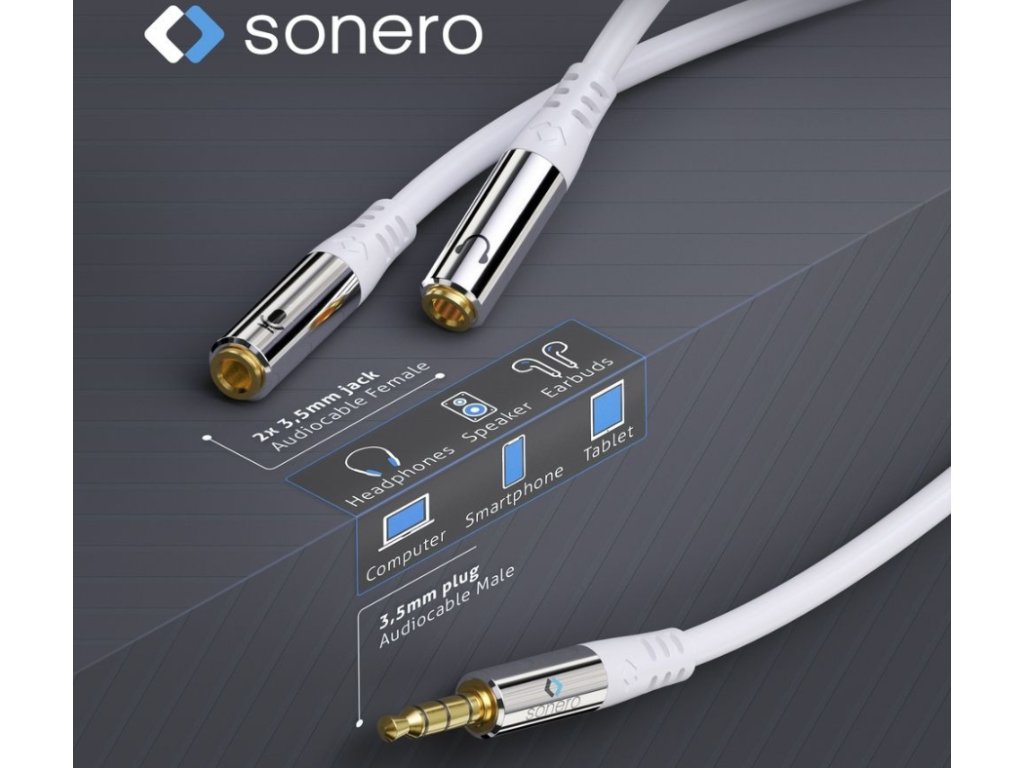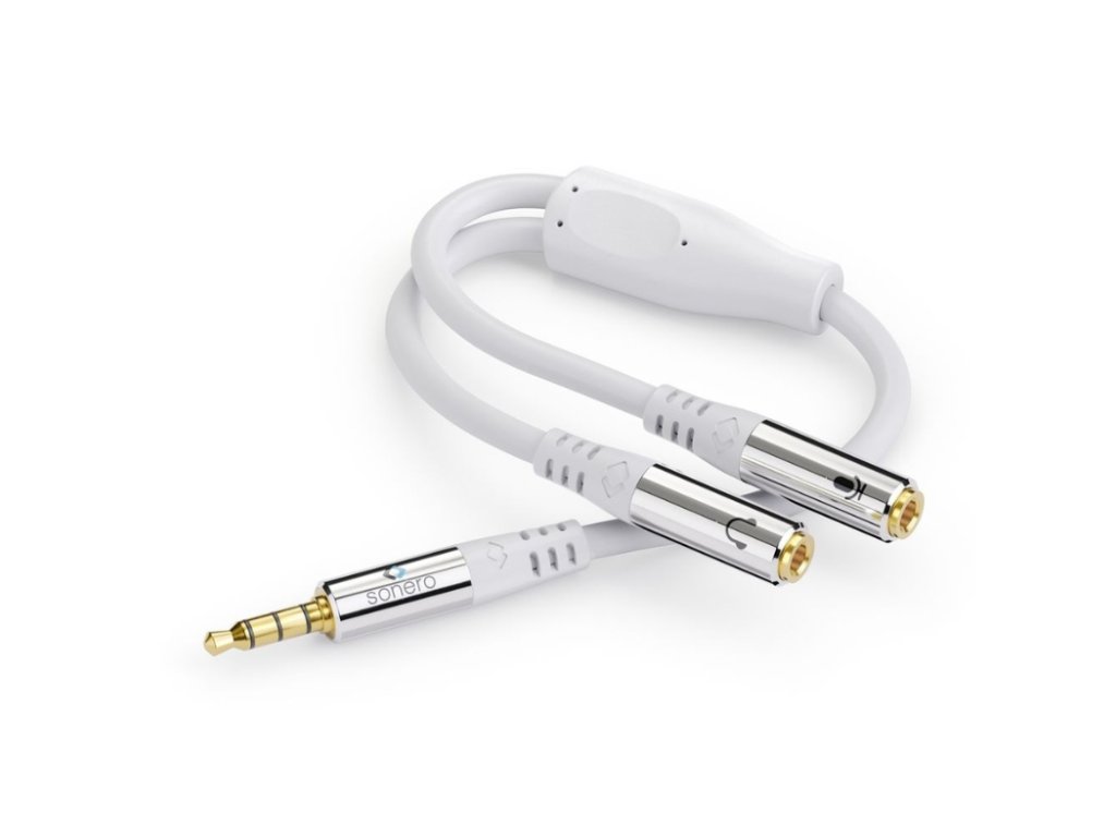 S-ACA012 Sonero adaptérový kabel 3,5mm jack 4pin → 2x 3,5mm jack 3pin, 0,25 m, bílý Rozšiřte možnosti svého audio zařízení s kvalitním adaptérovým kabelem Sonero. Tento kabel umožňuje snadné rozdělení 4pinového 3,5mm jacku (např. z notebooku, telefonu nebo ovladače) na dva samostatné 3pinové jacky, jeden pro sluchátka a druhý pro mikrofon. Ideální pro připojení headsetů s oddělenými konektory k zařízení s kombinovaným audio vstupem/výstupem. Hlavní vlastnosti: Rozděluje 4pinový 3,5mm jack (samec) na 2x 3pinový 3,5mm jack (samice) - sluchátka / mikrofon Délka: 0,25 m Pozlacené kontakty pro lepší vodivost a ochranu proti korozi Chromované hliníkové konektory s flexibilní ochranou proti ohybu Vysoce čisté měděné vodiče, dvojité stínění, odolný PVC plášť Barva: bílá Obousměrné použití bez nutnosti řešit směr zapojení Perfektní pro: Notebooky a ultrabooky s kombinovaným audio konektorem Herní ovladače, smartphony, tablety Připojení headsetů se samostatnými konektory pro mikrofon a sluchátkaDoplňkové parametry