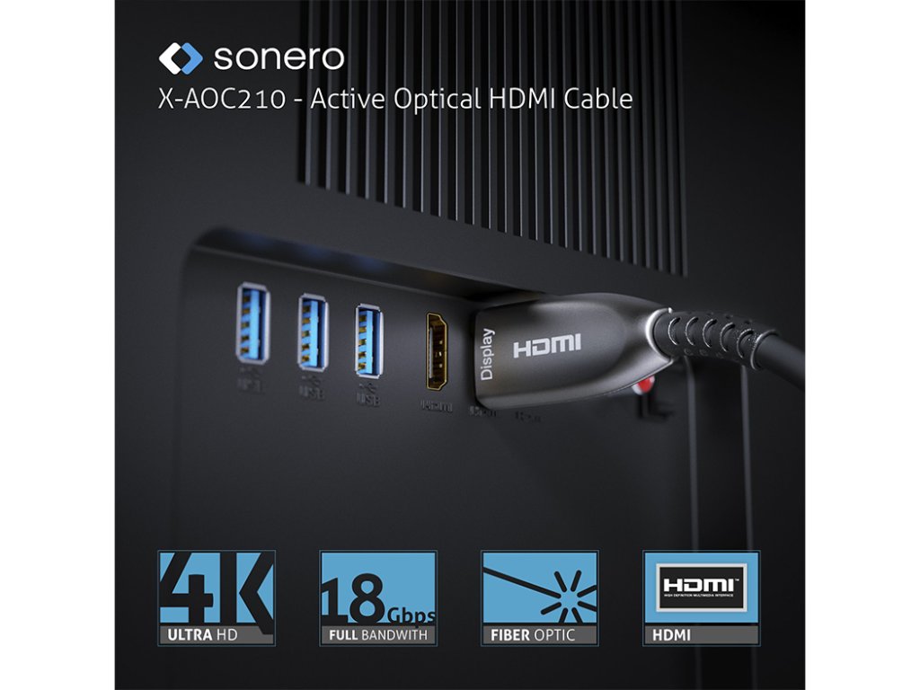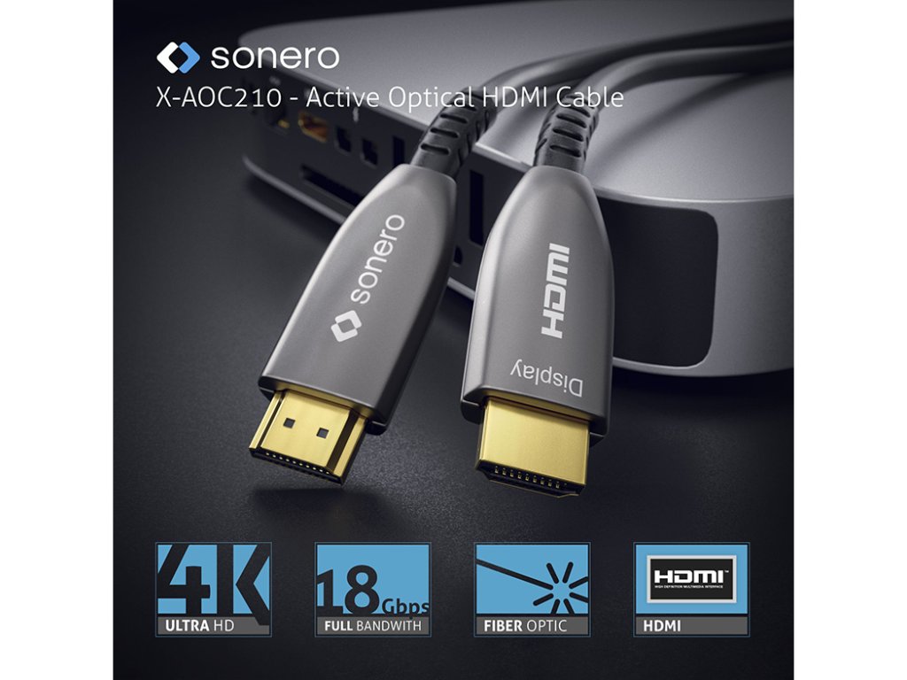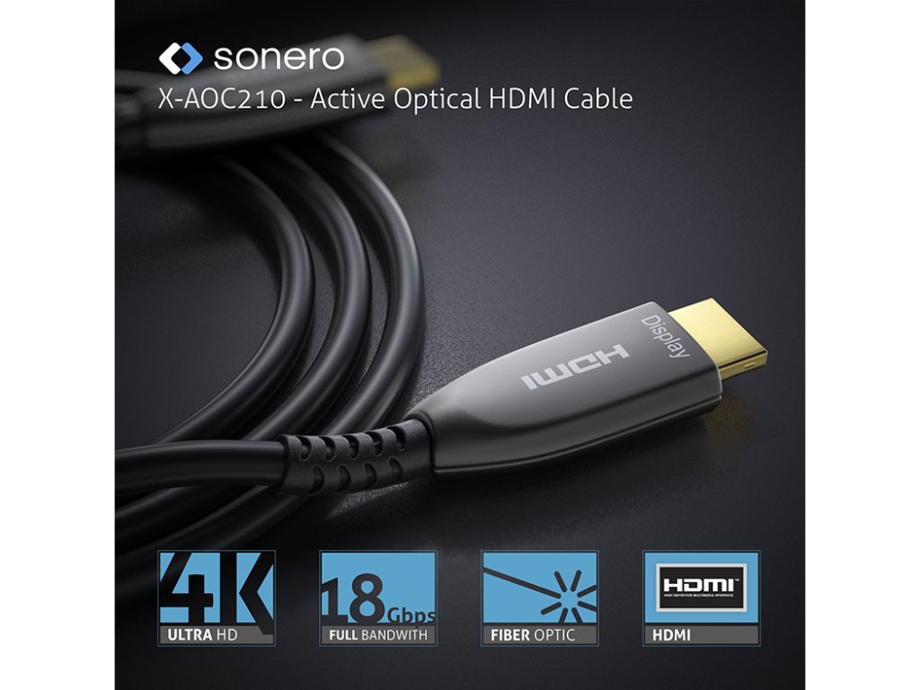 Sonero X-AOC210 4K vysokorychlostní HDMI AOC optický kabel X-AOC210 je HDMI AOC kabel pro rozlišení až do 4K / UltraHD / 2160p s 60Hz (4:4:4) včetně všech HDMI 2.0b funkcí. Kabel s vnějším průměrem 4.5 mm používá optické vlákno pro přenos AV signálu a měděné vodiče pro přenos dat a napájení. Tento kabel je vybaven HDMI konektory s celokovovým povrchem na obou stranách, pozlacenými kontakty a nabízí plnou ochranu EMI a nízký útlum. Celý systém je Plug&Play a je napájen přímo přes HDMI, takže nevyžaduje extrení napájení. HDMI verze 2.0b - 18Gb/s pro rozlišení až do 4K UltraHD 60Hz Pozlacené kontakty, EMI odolnost, nízký útlum HDMI-A samec na HDMI-A samec, celokovový povrch Hybridní kabel - Optika pro AV; měď pro napájení a data, průměr 4.5mm AOC technologie - externí napájecí zdroj není potřeba Dostupné délky: 10 m, 15 m, 20 m, 25 m, 30 m, 40 m, 50 mDoplňkové parametry