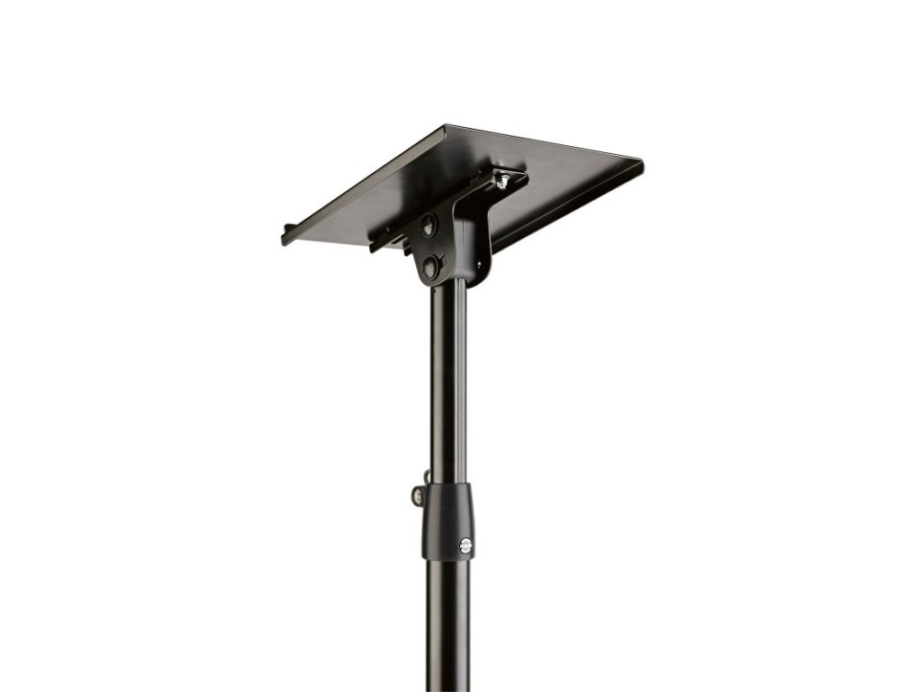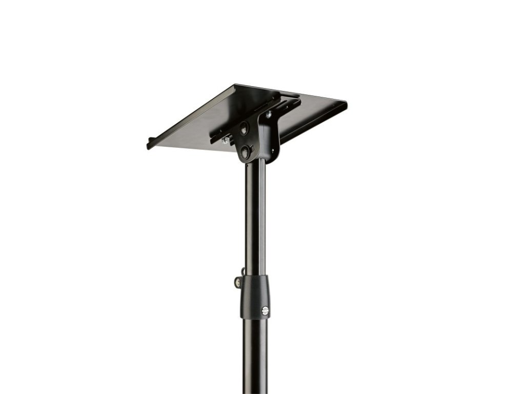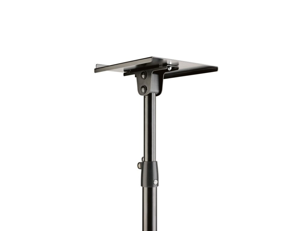 Stabilní ocelový stojan pro studiové monitory s trojnohým podstavcem a naklápěcí nosnou deskou. Podstavec je opatřený plstěnými podložkami pro filtraci hluku. Plocha pro monitor je polohovatelná s možností naklonění o 12,5°. Hloubka desky 45 mm. Postupné nastavení výšky pomocí upínací páky po intervalech 50 mm do 10-ti pozic. Výška stojanu 800/1300 mm. Nosnost 35 kg. Vyrábí se v černé barvě.