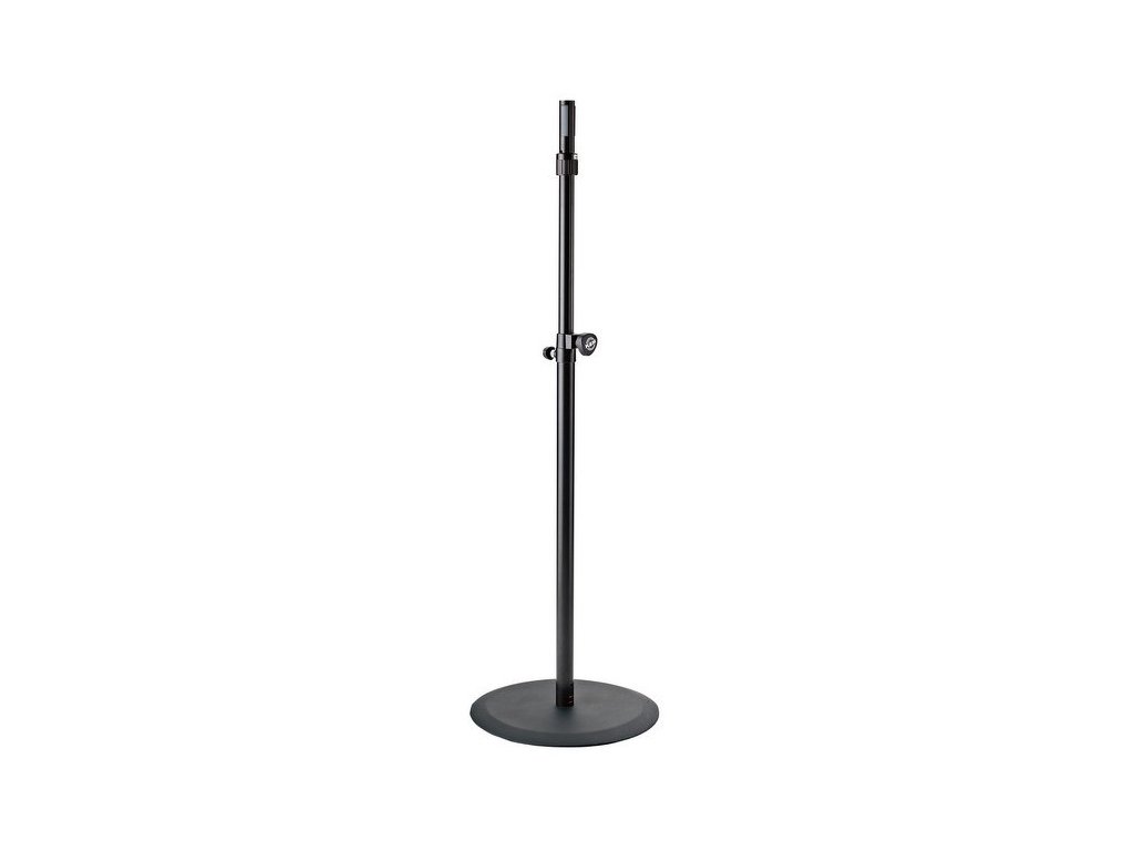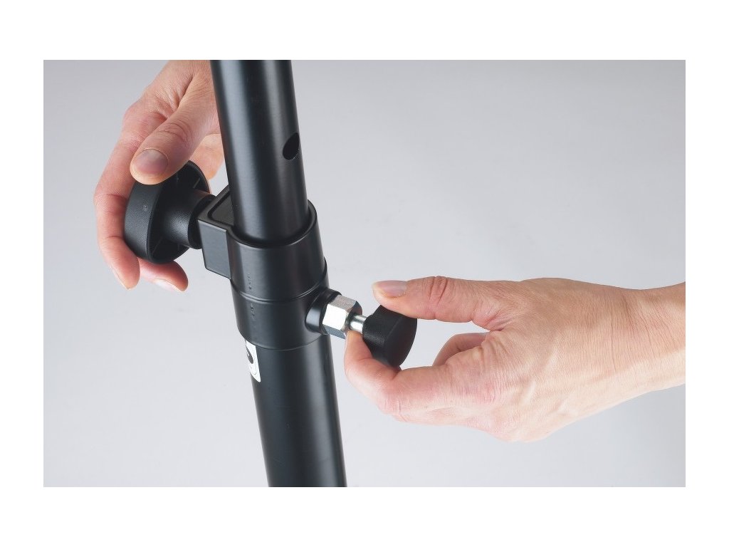 Reproduktorový stojan s jedinečným patentovaným systémem »Ring Lock«, který poskytuje stabilní a pevné uchycení reproduktorů bez vibrací. Připojení reproduktoru je snadné a provádí se pomocí praktického prstencového zámku, který se jednoduše připevní a přišroubuje. Těžký litinový podstavec s relativně malým průměrem 450 mm vyžaduje malý prostor. Osvědčený pružinový šroub s aretačním šroubem umožňuje snadné a bezpečné nastavení výšky. Výška stojanu 1125/1810 mm. Nosnost 20 kg. Vyrábí se v černé barvě.