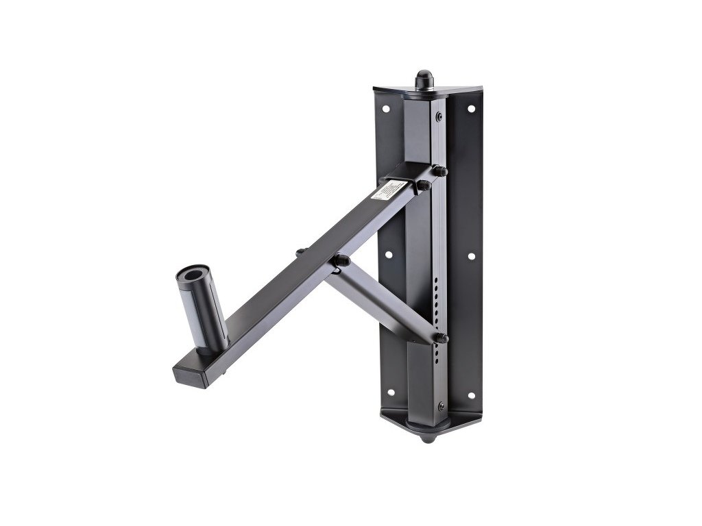 Otočný a sklopný reproduktorový nástěnný držák. Vyrobený z oceli. Nosnost 50 kg. Držák má 11 různých nastavení sklonu pohybujících se po 22 °. Otočný čep je nastavitelný do libovolného úhlu. Patentované ložiskové ukotvení pro eliminaci rezonance. Pro reproduktory s vnitřním průměrem od 35 do 37 mm. Vyrábí se v černé barvě.