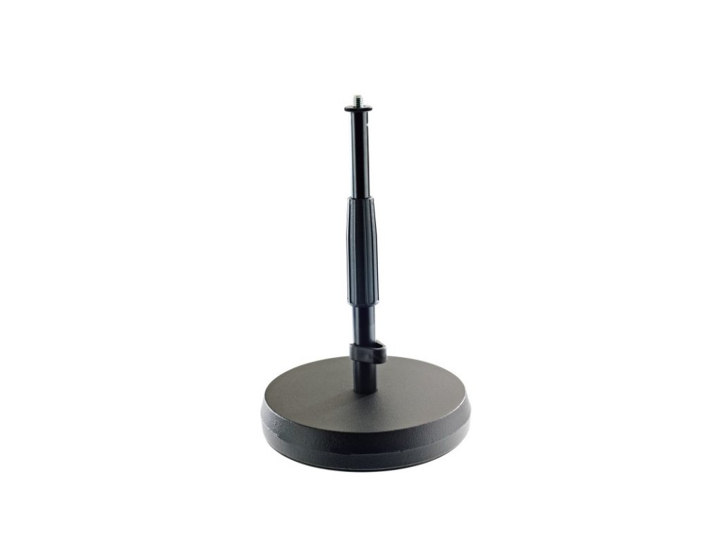 Nízký mikrofonní stojan s malou litinovou základnou. Hodí se pro snímání perkusí nebo kytarových a basových aparatur. Litinový podstavec o průměru 180 mm má antivibrační gumovou vložku. Výška 217/347 mm. Vyrábí se v černé barvě.
