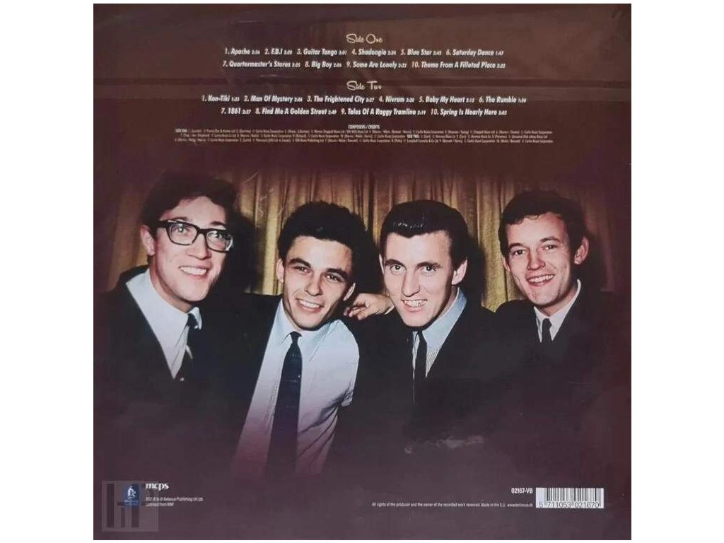 The Shadows - 20 Golden Hits Marathon Media International Ltd. 180g, Reference master vinyl, Limited edition, 100 % analogové album s referenční zvukovou kvalitou- Analog Experience Exkluzivní obal a příslušenství podtrhuje výjimečnost těchto nahrávek od Bellevue Entertainment Side A Apache 2:56 F.B.I 2:20 Guitar Tango 3:01 Shadoogie 2:24 Blue Star 2:45 Saturday Dance 1:47 Quartermaster's Stores 2:25 Big Boy 2:06 Some Are Lonely 2:22 Theme From A Fillezed Place 2:22 Side B Kon-Tiki 1:55 Man Of Mystery 2:06 The Frightened City 2:27 Nirvram 3:20 Baby My Heart 2:15 The Rumble 1:56 1861 2:27 Find Me A Golden Street 2:49 Tales Of A Raggy Tramline 2:19 Spring Is Nearly Here 3:03Doplňkové parametry