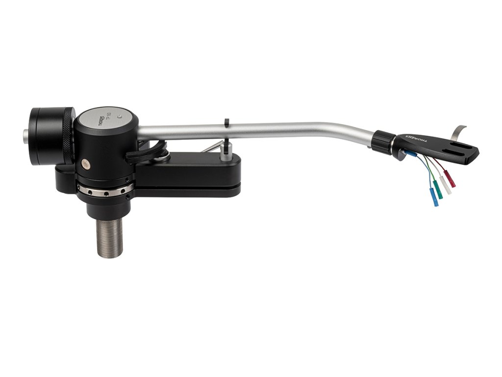 J Shape 9" raménko pro gramofony 9palcové rameno s optimalizovaným rozložením hmotnosti Thorens TP 160 – špičkové raménko s řezným ložiskem TP 160 je devítipalcové radiální rameno ve střední hmotnostní třídě. Jeho příznivé rozložení hmoty a vysoká pevnost z něj činí ideální nosič pro ty nejjemnější snímače. Ty pasují do standardní původní headshell, která byla předělána společně s ramenem. Alternativně TP 160 také akceptuje jakoukoli jinou hlavici s bajonetem SME nebo integrovanými kazetami, jako je Ortofon SPU. Vzhledem k tomu, že efektivní délky různých hliněných boxů se mohou mírně lišit, zajistili jsme také axiální nastavení ramenové trubky, aby byl vždy zajištěn dokonalý přesah. Dokonalé řezné ložisko Helmut Thiele Designér Thorens Helmut Thiele dal TP 160 výkonný, jasný tvar, který vypadá působivě na starých i nových discích. Pro horizontální pohyb je rameno vybaveno kvalitními japonskými kuličkovými ložisky, která jsou upravena pro dokonalý hladký chod a volnost hry a zachovávají tyto vlastnosti i při náročném každodenním používání. Rameno se pohybuje vertikálně v našem zcela nově vyvinutém řezném ložisku. Gravitace, magnetismus a precizní mechanika zde spolupracují, aby vytvořily definovanou mobilitu bez vůle a bez jakéhokoli krouticího momentu. Ložisko je samostředící, bez tření, bezúdržbové a robustní. U řezného ložiska Thorens se kalená ocelová hrana setkává s dvoudílnou ložiskovou pánví, která umožňuje prakticky lineární kontakt a nemá axiální vůli. Tradiční slabinou řezných ložisek je jejich většinou nedefinované boční omezení. Naše nové magnetické boční vedení tento problém řeší a drží řezné ložisko přesně ve středu jeho pláště bez kontaktu nebo tření. MC světové třídy cítí toto přesně definované centrování bez síly a děkují mu zvýšenou schopností sledování a uvolněným výkonem bez stresu. Rozsáhlé, praktické možnosti nastavení TP 160 lze široce a reprodukovatelně nastavit. Nastavení VTA je definováno a zajištěno pomocí uzamykatelného jemného závitu na základně ramene. Síla bruslení je kompenzována uzavřeným, kalibrovaným, plynule nastavitelným pružinovým mechanismem. Headshell lze otáčet pro nastavení azimutu. Z výroby je přednastaven na přesnou paralelní polohu, takže u vysoce kvalitních systémů není obvykle nutná žádná korekce. Síla sledování je tradičně vytvářena statickou rovnováhou. Díky své dvoudílné protizávaží si rameno stejně dobře poradí s těžkými i lehkými snímači a headshelly. Se standardní helmou vyrobenou z masivního hliníku se TP 160 řadí do střední až těžké hmotnostní třídy. Účinnou hmotnost lze v případě potřeby zvýšit nebo snížit pomocí vhodných hlav. Obrovská síla jeho velkokalibrové, rezonančně optimalizované ramenové trubky a konstrukce ložisek rozptylující energii umožňují TP 160 vynikající výkon i s tvrdými, mechanicky náročnými MC.Doplňkové parametry
